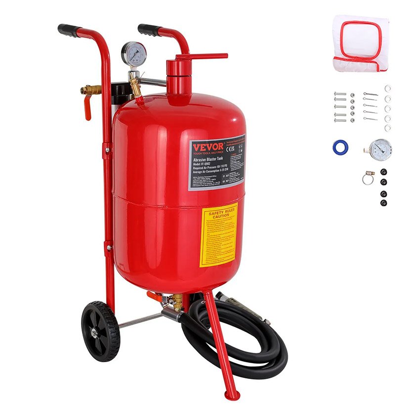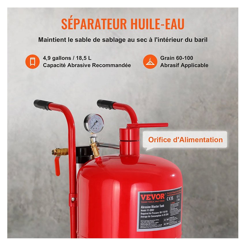 ✔ Fonctionnement fluide et prévention des obstructions : la sableuse VEVOR est équipée d’un séparateur eau-huile avec manomètre qui élimine efficacement l’humidité de l’air comprimé et empêche ainsi les abrasifs humides d’obstruer la vanne. Nous recommandons une capacité de 4,9 gallons (environ 18,5 litres) pour l’abrasif, idéale pour les grains 60 à 100 comme le sable de silice, l’aloxite, les billes de verre, etc. (IMPORTANT : l’abrasif utilisé doit être sec, sinon il risque de provoquer une obstruction.)