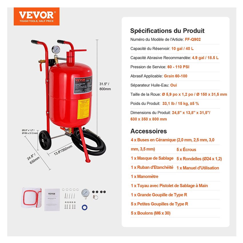 VEVOR Sableuse 40L équipée d’une vanne d’arrêt, d’un manomètre, d’une buse en céramique, d’un tuyau de 2,5 m, d’un entonnoir de remplissage, d’un séparateur d’eau et de roues en caoutchouc de 6 pouces. Sableuse portable à grains fins.