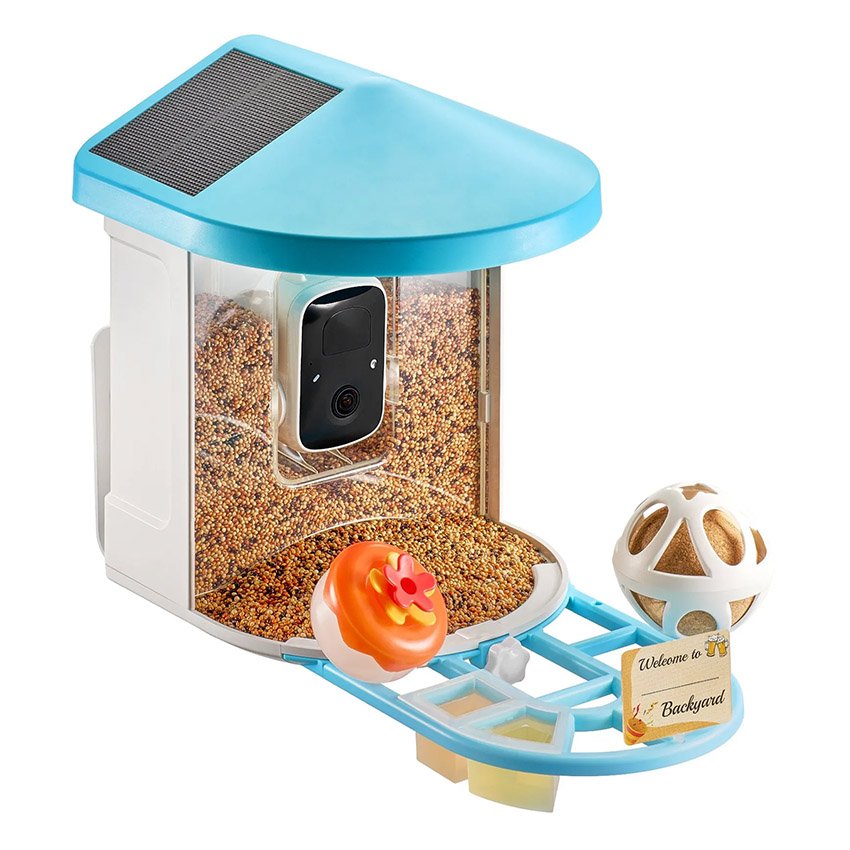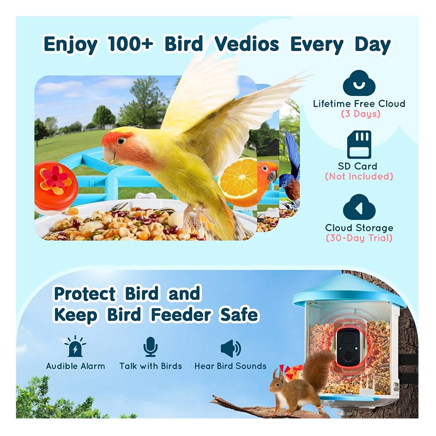 – Regardez, parlez et profitez : Profitez de plus de 100 vidéos d’oiseaux chaque jour avec notre cloud gratuit à vie (3 jours) et notre stockage cloud (essai de 30 jours). Notre nichoir intelligent comprend une alarme sonore et un système audio bidirectionnel, vous permettant d’effrayer les écureuils tout en parlant avec les oiseaux et en entendant leurs sons. La batterie intégrée de 5 200 mAh et 2 panneaux solaires assurent une alimentation électrique constante.