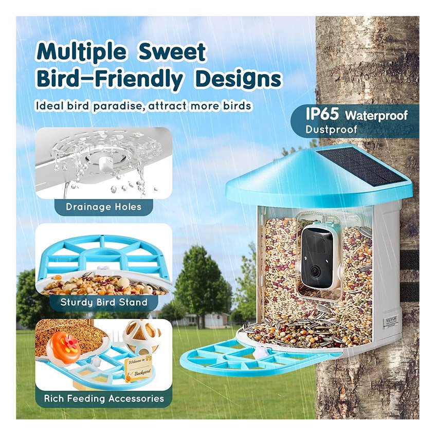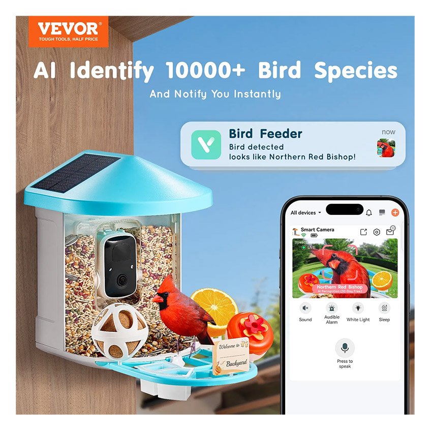 – L’IA identifie plus de 10 000 espèces d’oiseaux : La mangeoire intelligente pour oiseaux VEVOR avec caméra est dotée d’un système de reconnaissance IA avancé (gratuit pendant 30 jours) qui peut identifier plus de 10 000 espèces d’oiseaux. Il capture et identifie automatiquement chaque oiseau visiteur, tout en vous avertissant instantanément via l’application téléphonique.