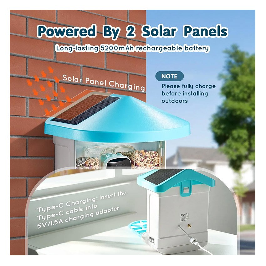VEVOR Mangeoire Oiseaux avec Caméra Intelligente 2K HD AI Caméra Identifie 10000 Espèces d’Oiseaux, 2 Panneaux Solaires, Capture Auto, Notification Instantanée, pour Extérieur Amoureux des Oiseaux