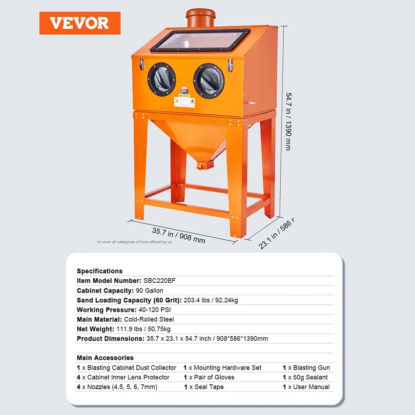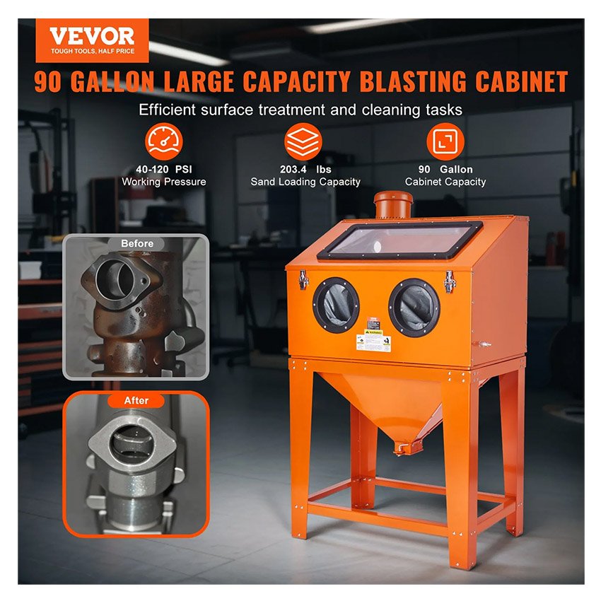 – Traitement de surface efficace : l’armoire de sablage VEVOR SBC220BF offre une capacité généreuse de 90 gallons, pouvant accueillir jusqu’à 203,4 livres de médias de sablage. Doté d’un récupérateur de poussière de 1,6 HP. Fonctionnant à seulement 5cfm à 40-120PSI, il gère efficacement diverses tâches, parfait pour les projets de rénovation de bricolage à la maison ou dans le garage.