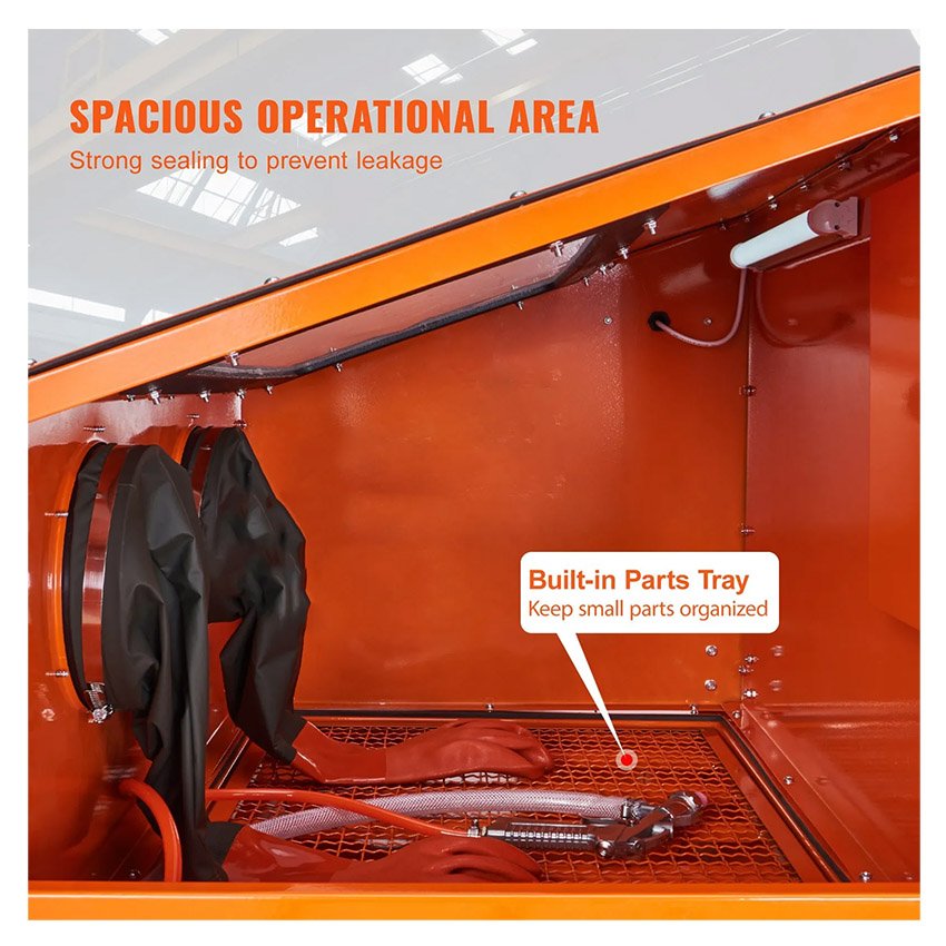 – Moins de fuites de poussière, espace de travail plus propre : l’armoire de sablage à air VEVOR dispose d’une bande d’étanchéité préinstallée pour une étanchéité supérieure. Il est livré avec un matériau d’étanchéité et un filtre à air, empêchant efficacement les fuites de poussière pendant le sablage, maintenant ainsi un environnement de travail plus propre.