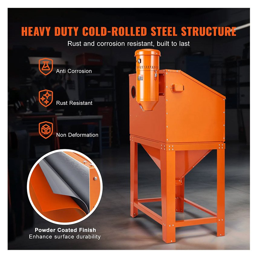 – Construit pour durer : fabriqué à partir d’acier laminé à froid robuste, l’armoire de sablage et le récupérateur de poussière offrent une dureté élevée et une durabilité exceptionnelle. Sa surface enduite de poudre améliore la résistance à la corrosion et à la rouille, garantissant ainsi qu’elle répond à vos besoins de sablage pour les années à venir.