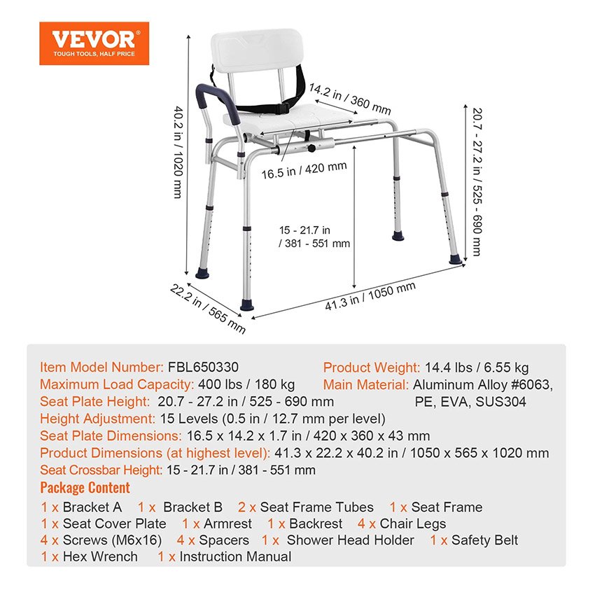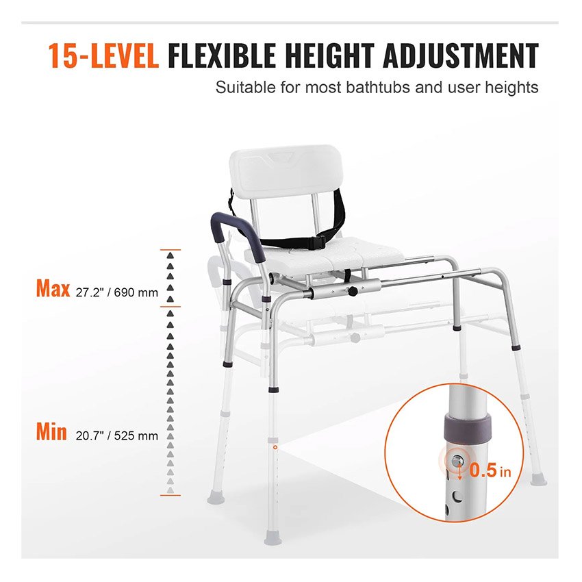 VEVOR Banc de Transfert Baignoire Coulissant, Sièges de Douche Antidérapant, Banc d’Accès au Bain avec Siège Découpé, Hauteur Réglable et Dossier Réversible, pour Personnes Âgées et Handicapées