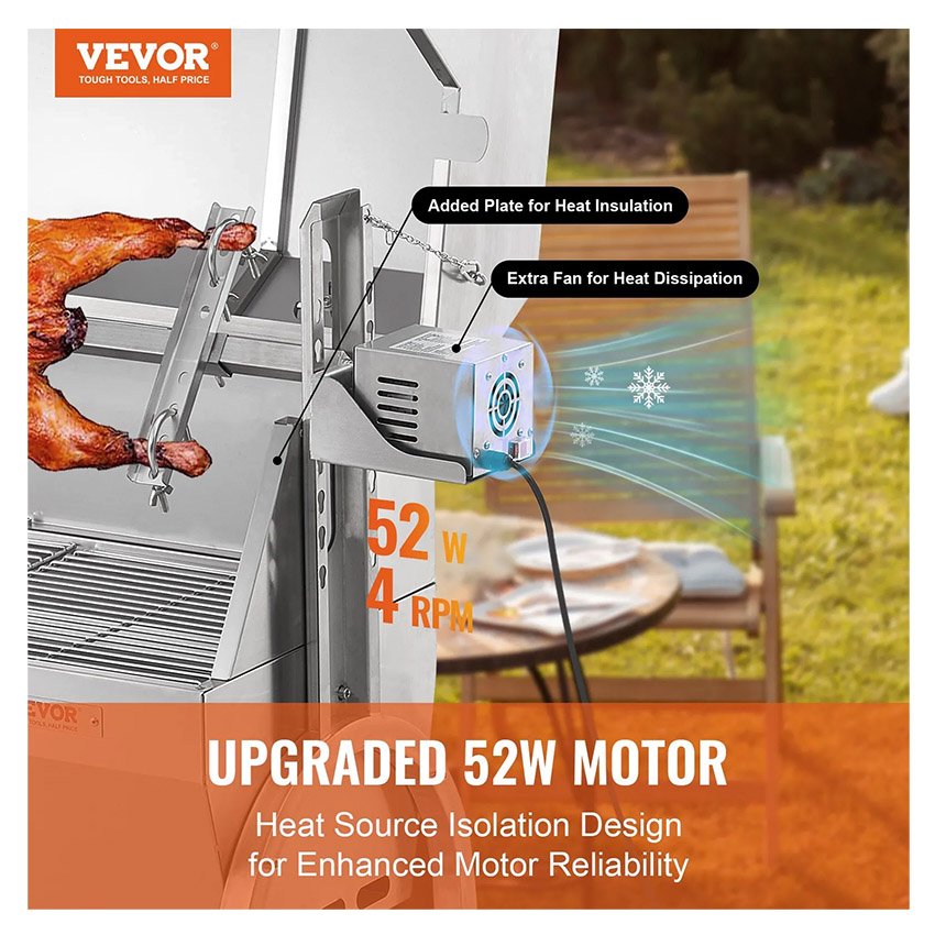 – Bouclier thermique amélioré : le kit de rôtisserie pour gril est doté d’un moteur nouvellement amélioré, ce qui facilite la cuisson au gril ! Il comprend un puissant moteur de 52 W qui peut faire tourner sans effort la broche à 4 tr/min. La plaque chauffante agrandie et la puissance accrue du ventilateur du moteur empêchent efficacement les sources de chaleur d’impacter le moteur, réduisant ainsi les dysfonctionnements du moteur.