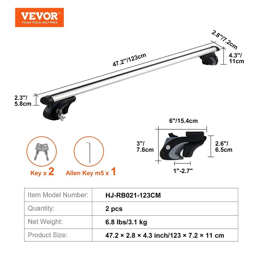 VEVOR Barres transversales de toit universelles, 123 cm, barre supérieure de voiture en aluminium, compatible avec les rails latéraux surélevés, réglable avec verrous, pour SUV, berline, fourgonnette