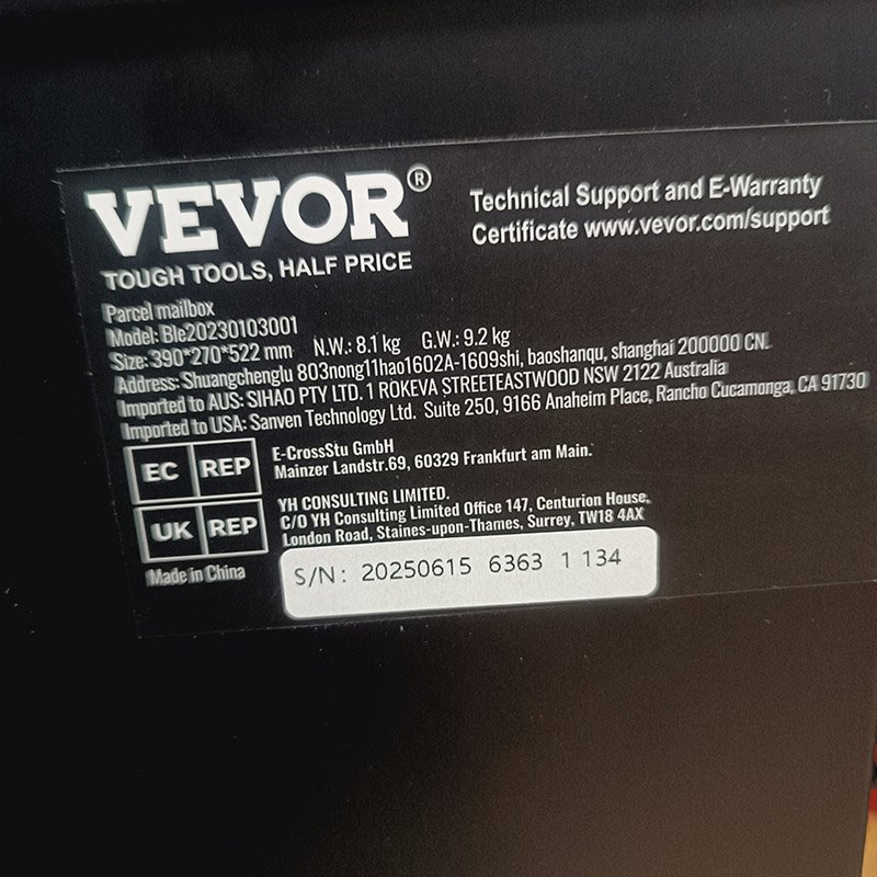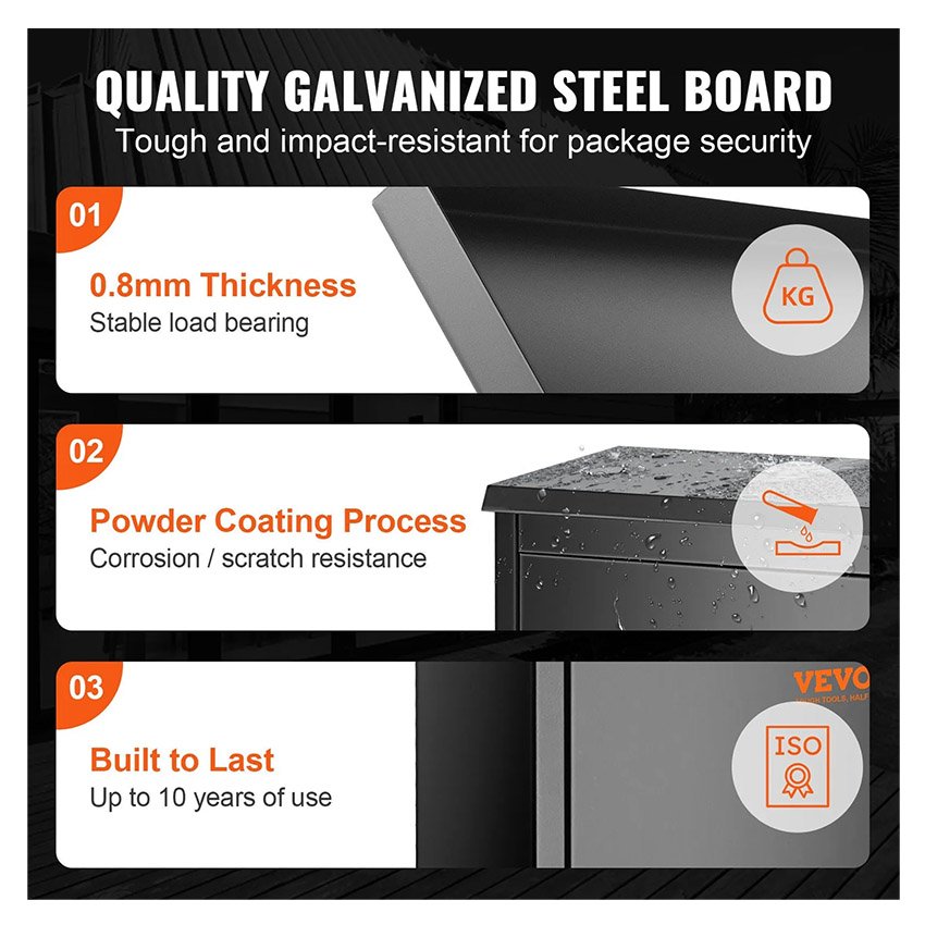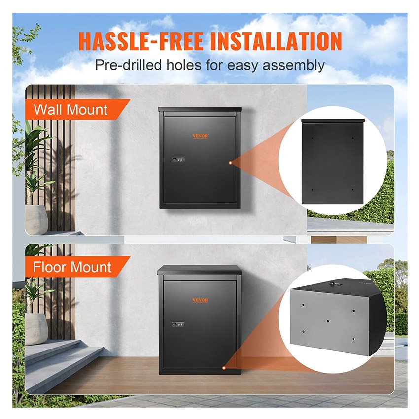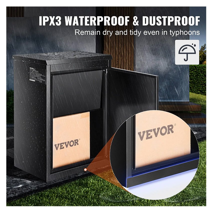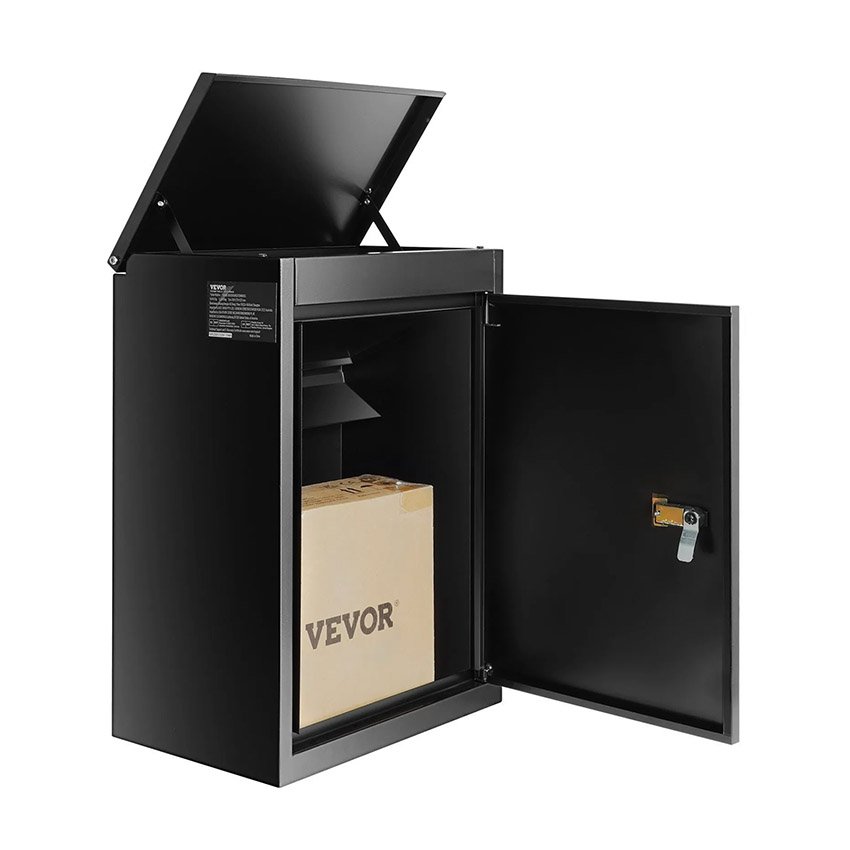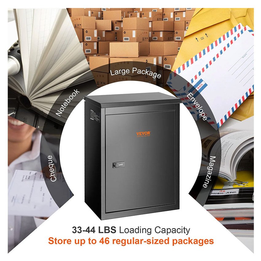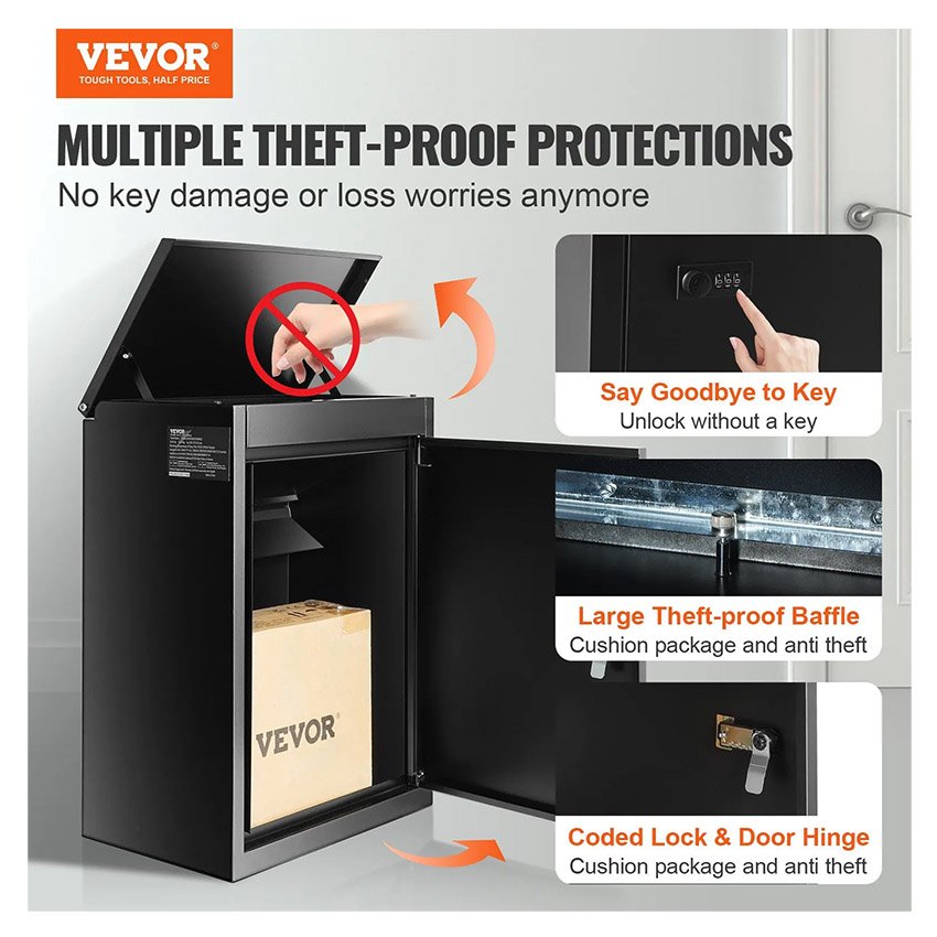– Protections antivol multiples : Ne craignez plus de perdre vos clés et de ne pas pouvoir récupérer vos colis. La boîte de dépôt VEVOR (39,1 cm x 26,9 cm x 52,1 cm) est équipée d’une serrure à code sécurisée et d’une charnière interne pour une protection optimale de vos colis. Un large dispositif antivol a également été ajouté à la fente de dépôt, empêchant ainsi le vol des colis.