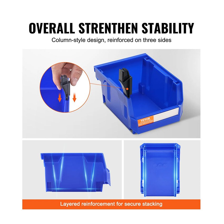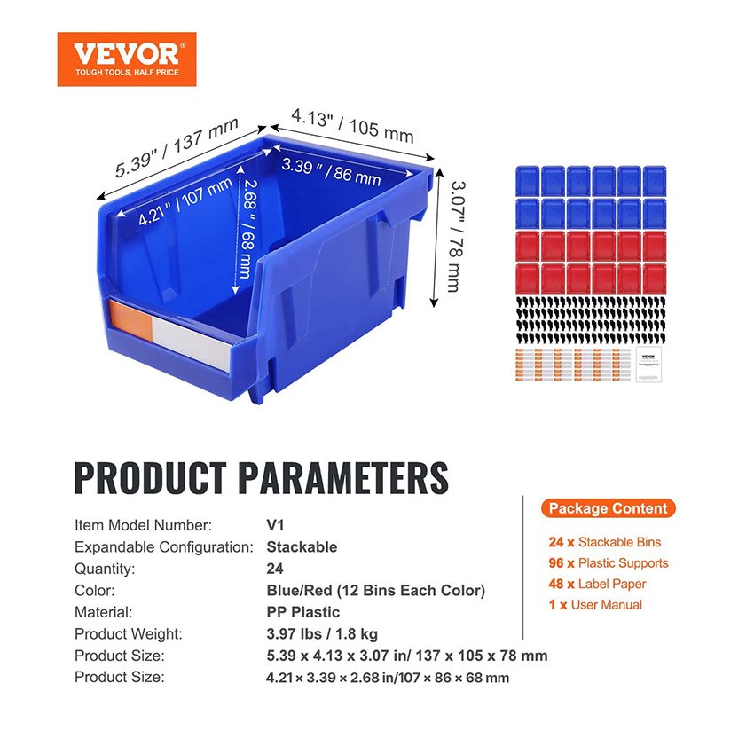 VEVOR Boîte de rangement en plastique, boîte de rangement empilable suspendue, bleu/rouge, lot de 24, contenants empilables robustes pour l’organisation des placards, de la cuisine, du bureau ou du garde-manger.