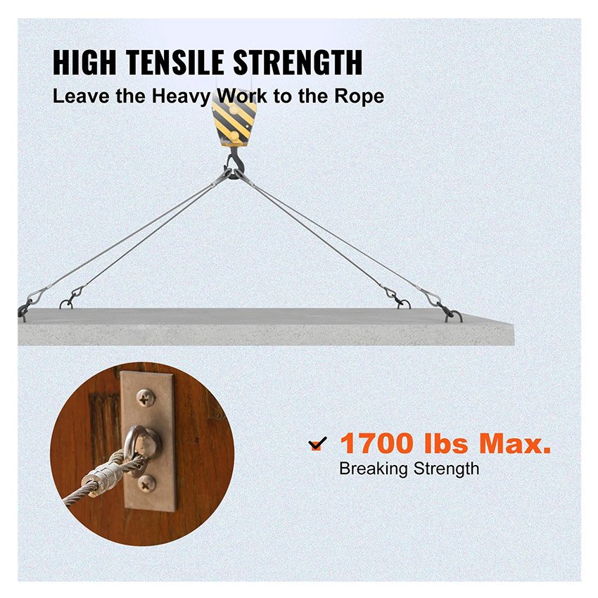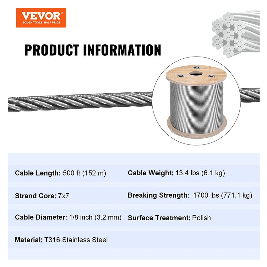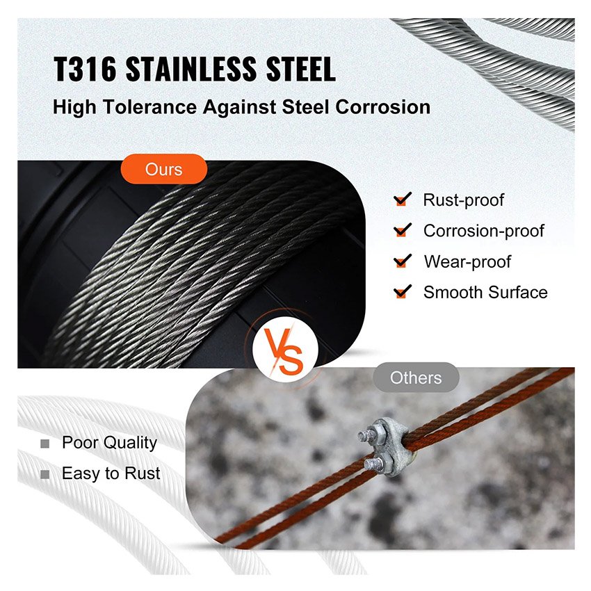 – Matériau en Acier Inoxydable T316 : Notre câble métallique est fabriqué en acier inoxydable T316 à haute résistance, à la fois résistant à l’usure et à la rouille, ne vous inquiétez pas de la corrosion, vous assurant une excellente durabilité et longévité.