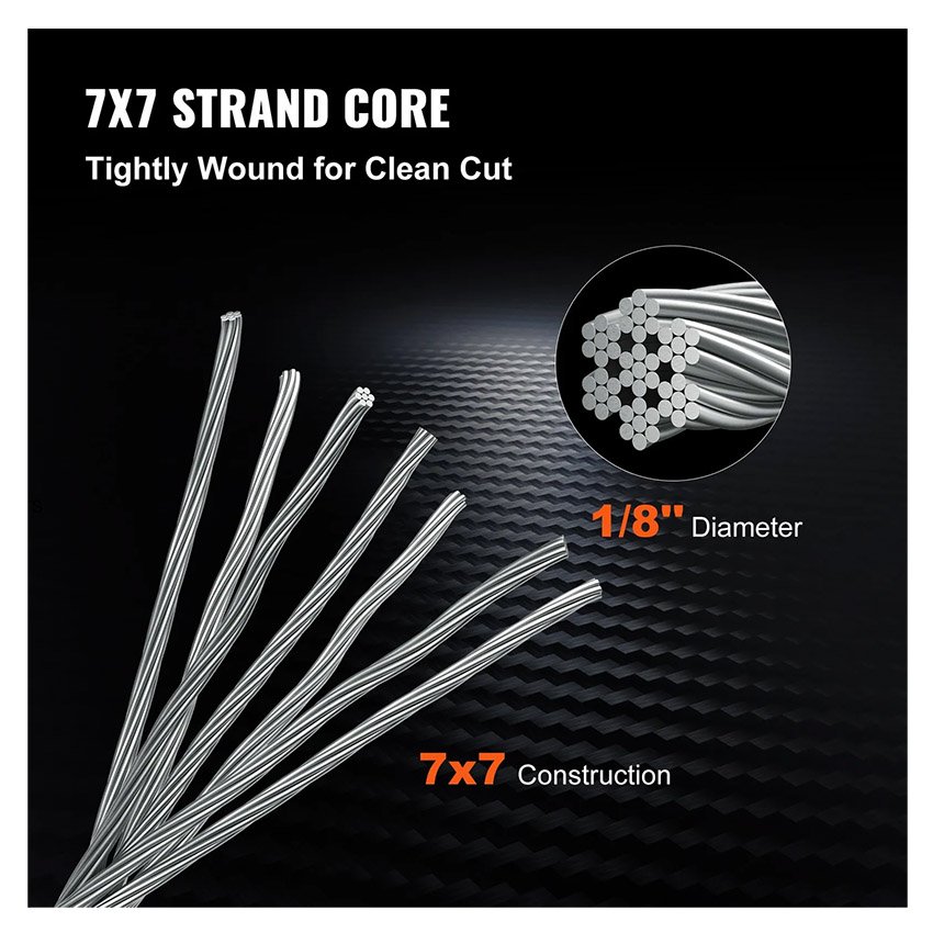 – Construction 7×7 : Construit en 7×7 construction, 7 groupes de 7 brins tressés ensemble pour former le câble, ce câble en acier a un noyau suffisamment solide pour assurer une longue durée de vie.
