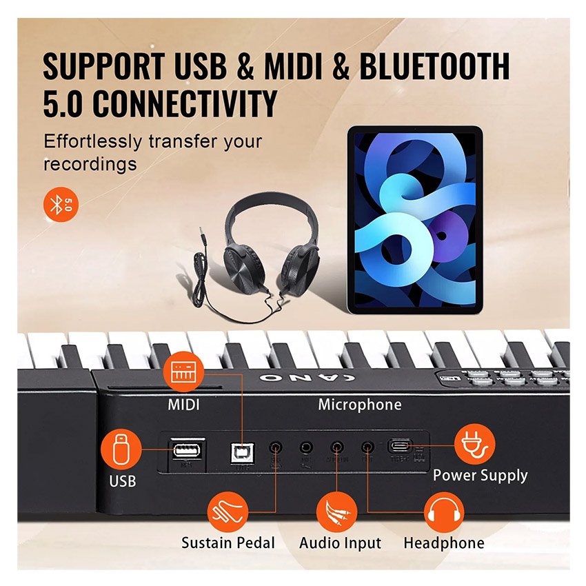 – Prise en charge Bluetooth 5.0, connectivité USB et MIDI : Équipé d’une entrée pour pédale de sustain, d’une entrée audio, d’une prise casque, d’une entrée microphone, d’un port USB et d’une transmission MIDI, ce piano à clavier numérique offre une intégration transparente avec les ordinateurs, les tablettes, les pédales de sustain, etc. Profitez d’options de connectivité polyvalentes pour améliorer votre expérience musicale.