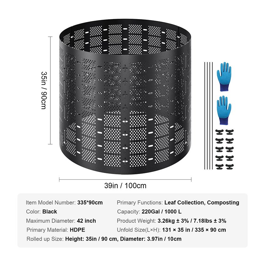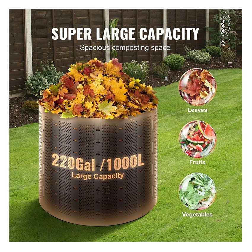 – Grand espace de stockage : Avec une capacité de stockage allant jusqu’à 1 000 litres (220 gal), ce grand composteur d’extérieur peut contenir une quantité importante de déchets, réduisant ainsi la fréquence de vidange. Il est idéal pour stocker et transporter les déchets compostables ou les déchets verts.