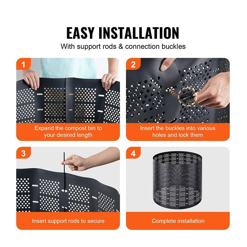 – Circulation d’air efficace : Les perforations du composteur de jardin assurent une excellente circulation de l’air, augmentant le contact avec la matière organique et favorisant la fermentation. Ceci accélère le compostage de déchets tels que les feuilles mortes, les tontes de gazon, le carton, le marc de café et les déchets de cuisine. Remarque : Du fait de sa légèreté, il est recommandé de bien maintenir le composteur en place après montage.