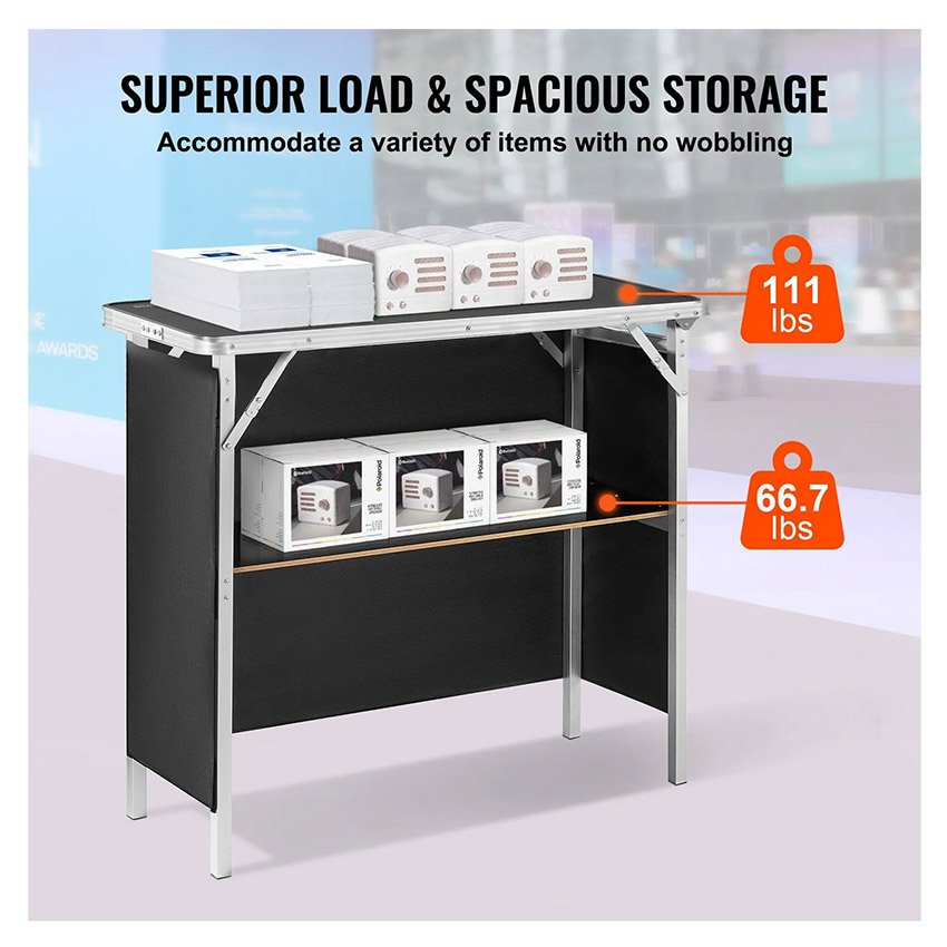 – DurabilitĂ© supĂ©rieure : notre comptoir de salon polyvalent et pliable est construit en alliage d’aluminium robuste et en panneau MDF pour rĂ©pondre Ă vos besoins d’affichage Ă long terme. Avec un dessus supportant jusqu’Ă 111 lb (50 kg) et une cloison de deuxiĂšme niveau pouvant supporter 66,7 lb (30 kg), c’est un outil fiable pour vos Ă©crans.