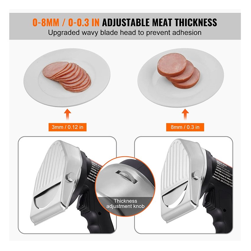 ✔ Épaisseur réglable : le coupe-gyroscope commercial dispose d'un bouton de réglage de l'épaisseur en haut, avec une plage de 0 à 8 mm/0 à 0,3 po. Vous pouvez ajuster la taille selon vos besoins, coupant le barbecue à la texture parfaite.