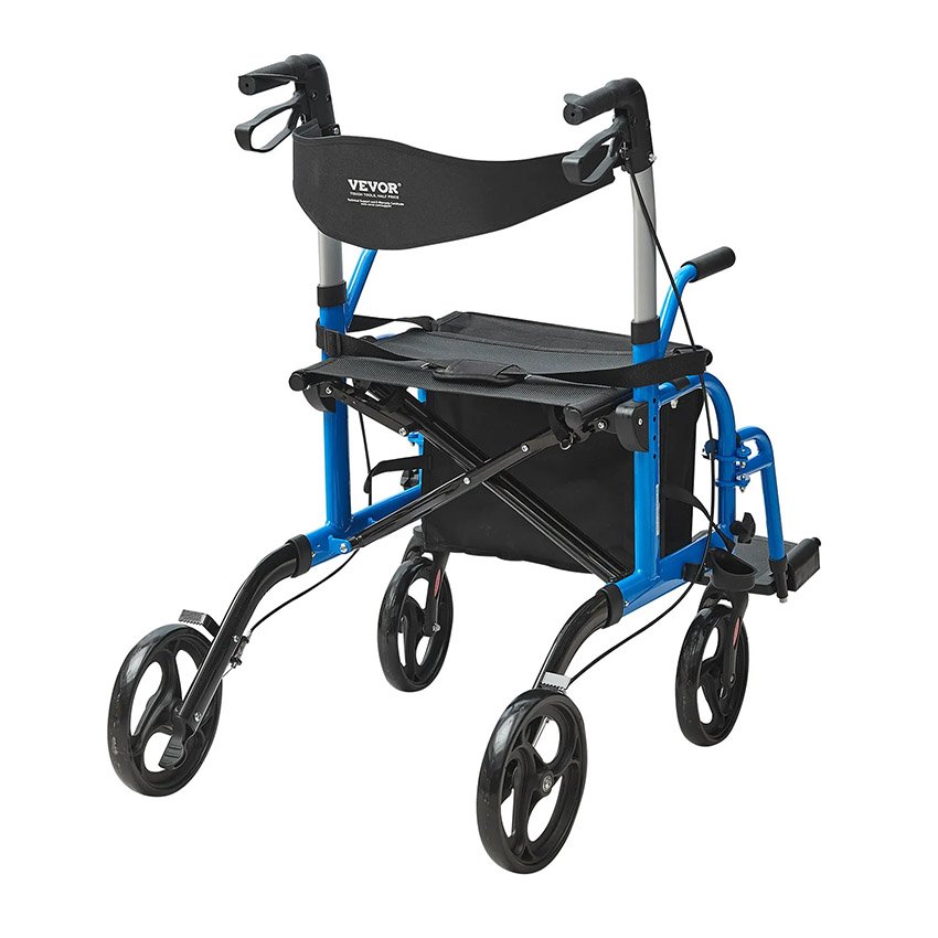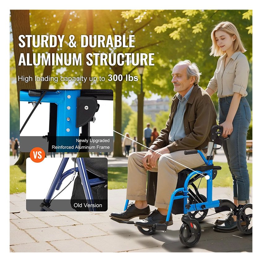 VEVOR Déambulateur roulant 2en1 pour personnes âgées, charge 136 kg, rollator fauteuil de transport pliable et repose-pieds, déambulateur léger en aluminium avec poignée réglable, roues tout terrain