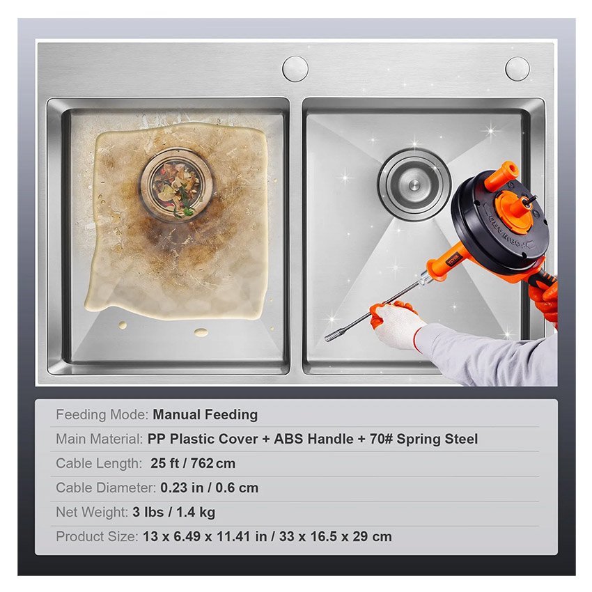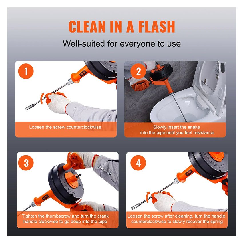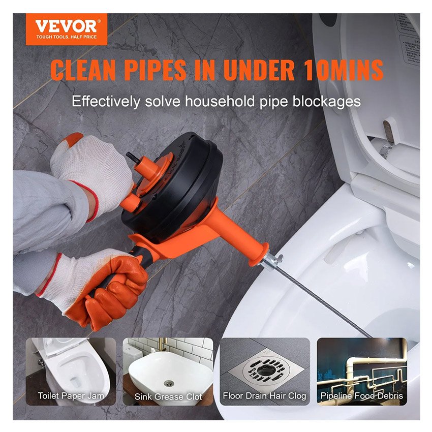 – Déboucheur multifonctionnel : le déboucheur portatif VEVOR offre une grande polyvalence et un excellent rapport qualité-prix, éliminant rapidement les débris des canalisations les plus tenaces, tels que le thé, les épluchures, les résidus alimentaires, le papier, les os, les cheveux et les vêtements, et débouchant les toilettes, les égouts, les siphons de sol, les éviers, les canalisations et les baignoires.