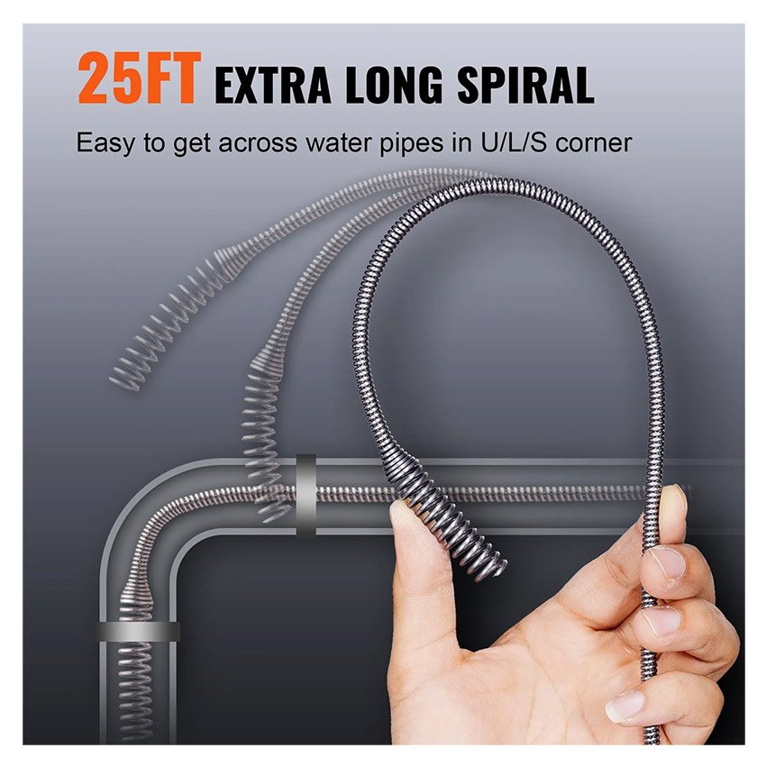 – Ressort suffisamment flexible : la tête en spirale de 6,35 mm d’épaisseur saisit facilement les bouchons de cheveux et nettoie en douceur et en profondeur grâce à un câble flexible mais rigide de 7,6 m qui permet d’atteindre les canalisations les plus difficiles d’accès, même dans les configurations en S ou en L. Ce produit est spécialement conçu pour le débouchage par trempage ; sa conception flexible lui permet d’atteindre tous les recoins sans effort.