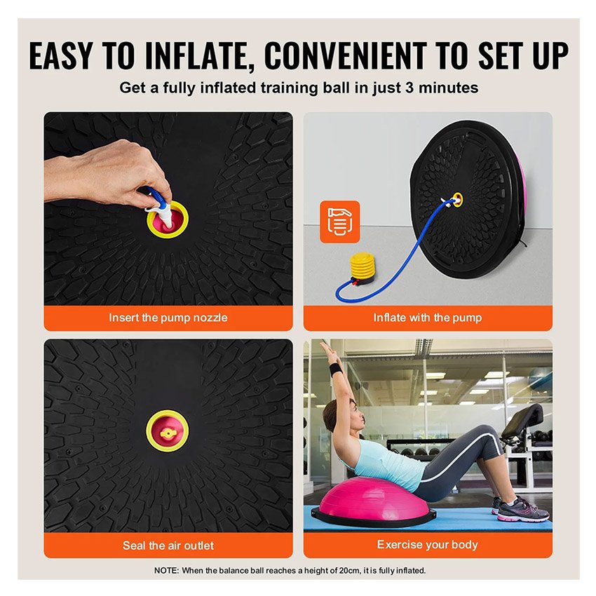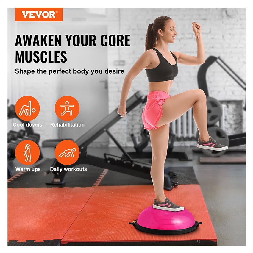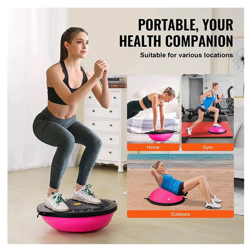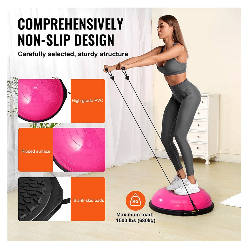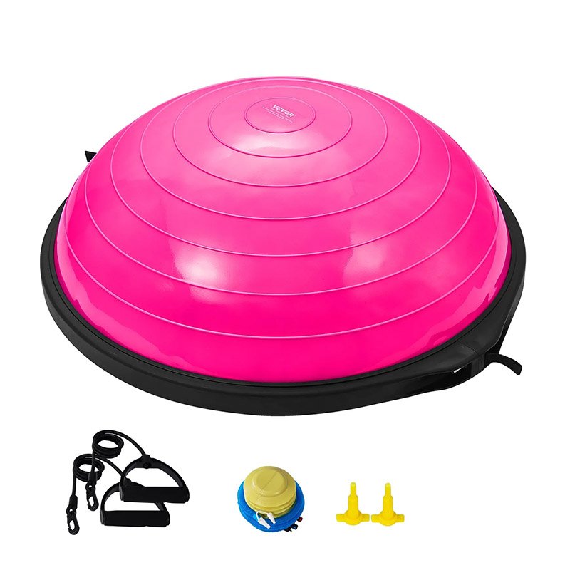 VEVOR Demi-ballon Fitness 66 cm, Ballon d’Équilibre Capacité 680 kg, Station d’Équilibre avec Bande de Résistance et Pompe à Pied, Entraînement Complet du Corps, Domicile, Gym, Gymnastique, Rose