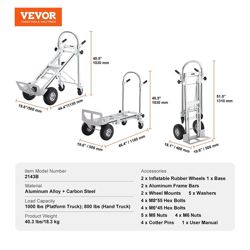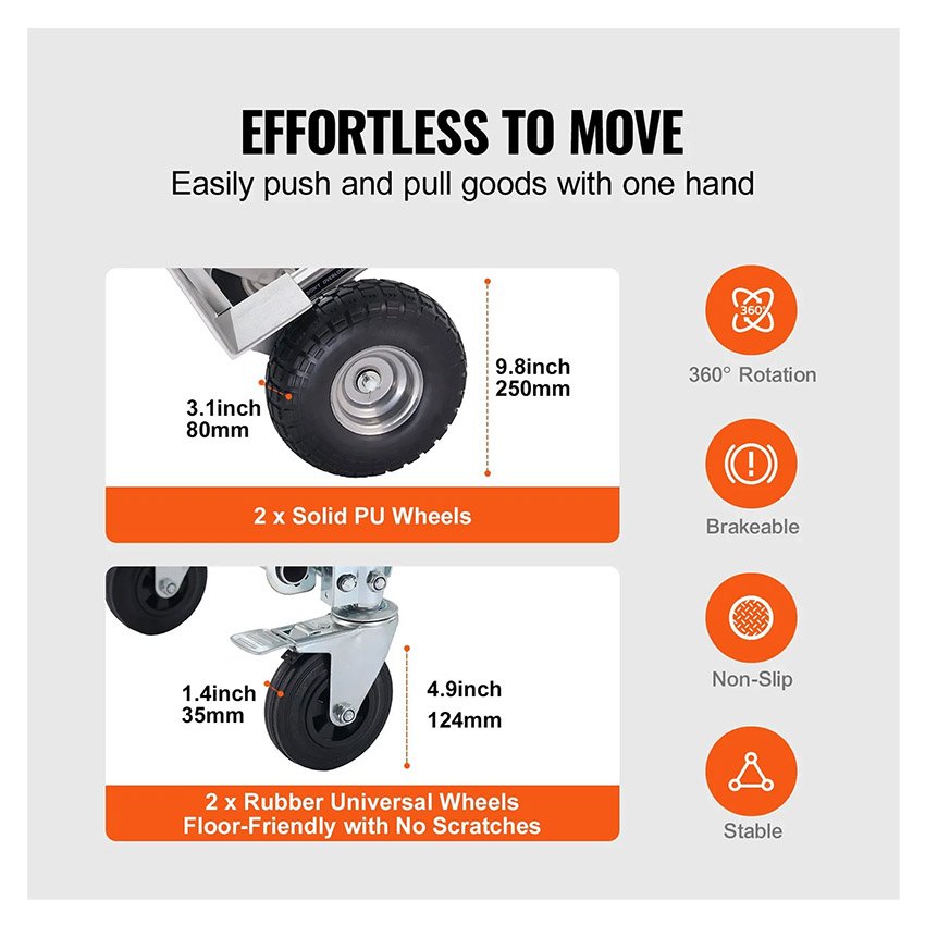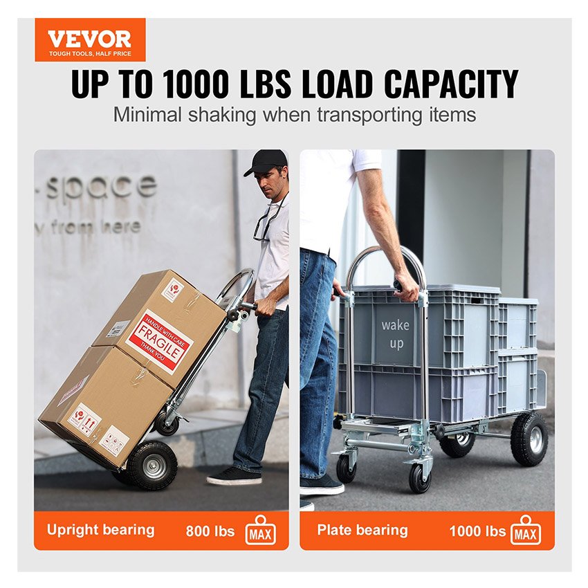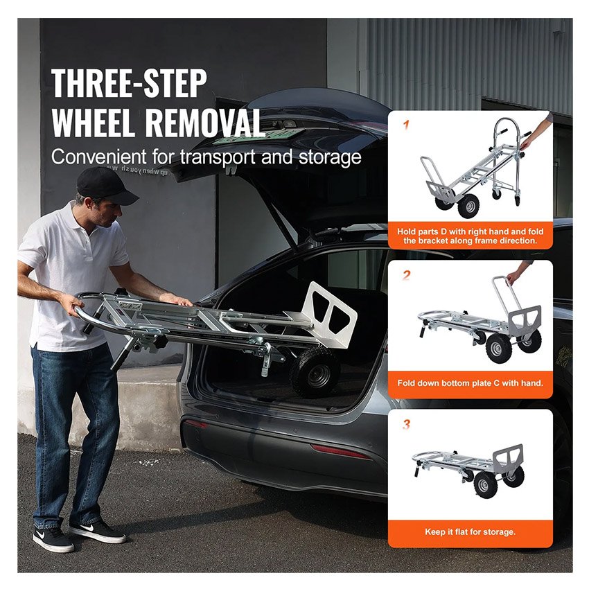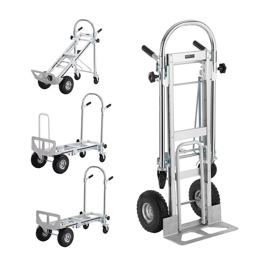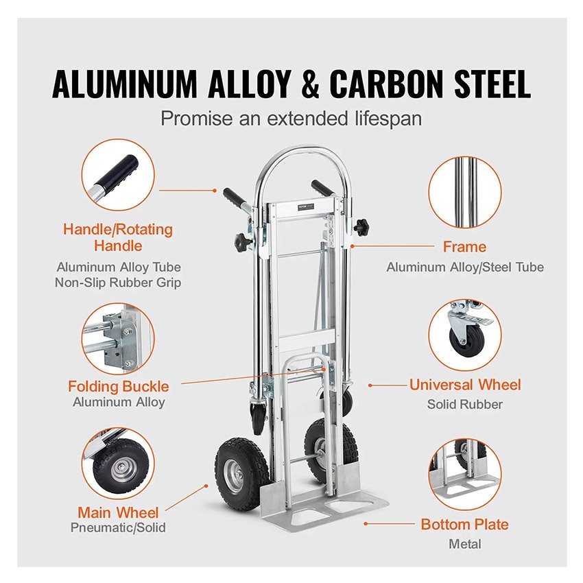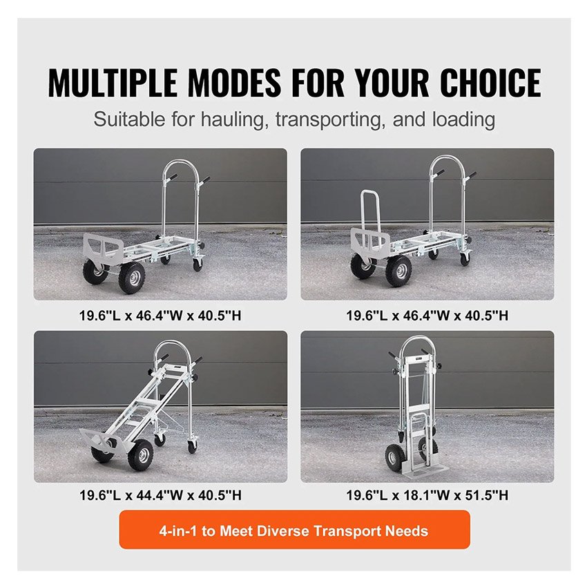 VEVOR Diable Pliant en Aluminium 4-en-1 Diable Chariot de Déménagement de Manutention Charge 454 kg Diable Convertible en Chariot à Plate-forme Roues Caoutchouc PU pour Transport Entrepôt Marchandises