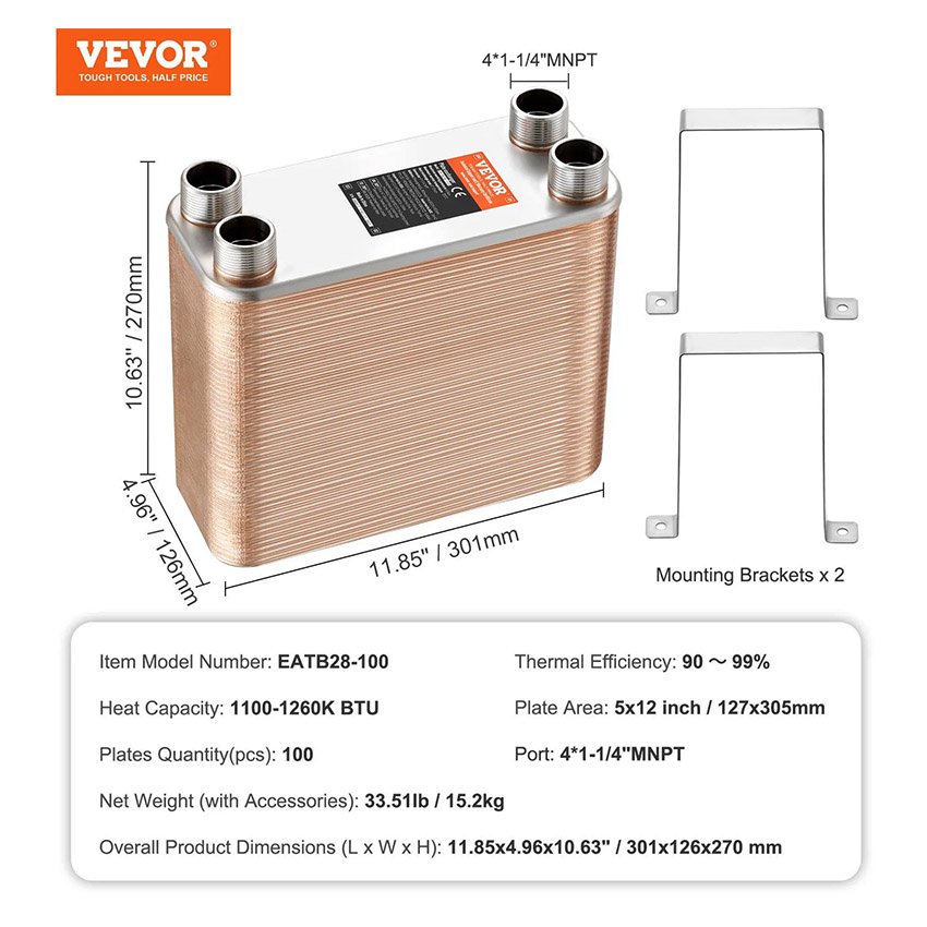 VEVOR Échangeur de chaleur à plaques brasées, 127×305 mm, échangeur thermique 100 plaques en cuivre/acier inoxydable 316L pour chauffage au sol, chauffage d’eau, fonte de neige, refroidissement bière
