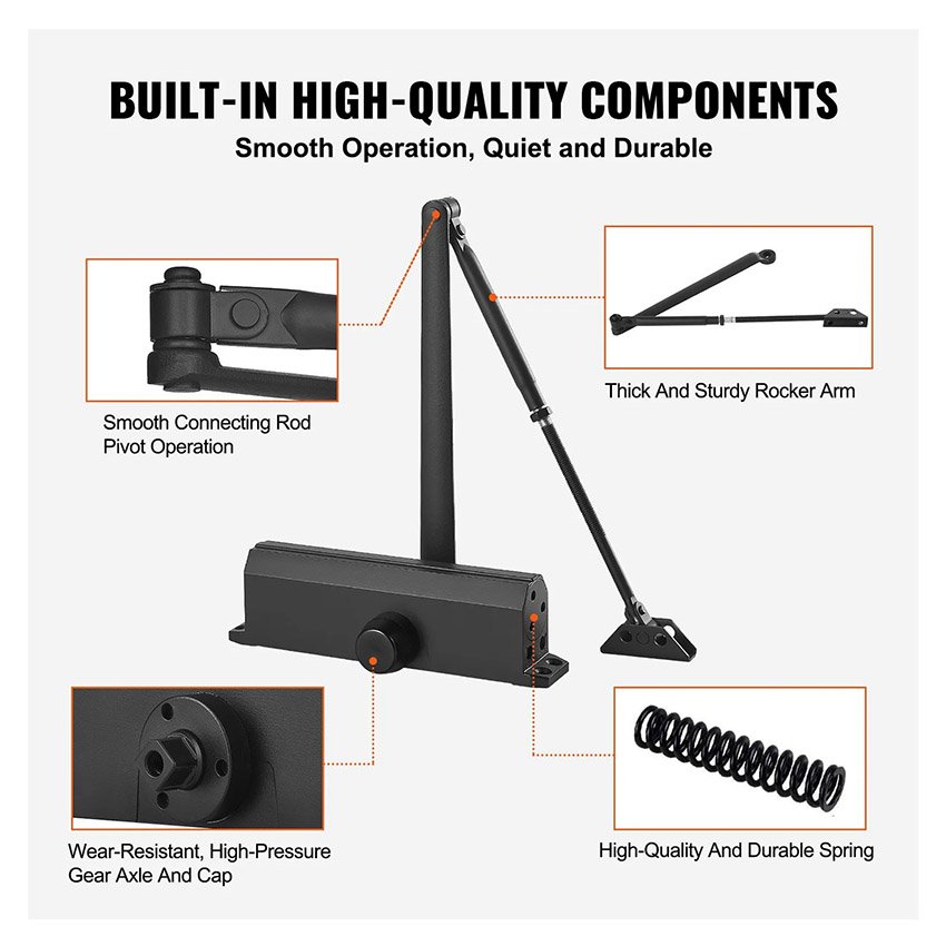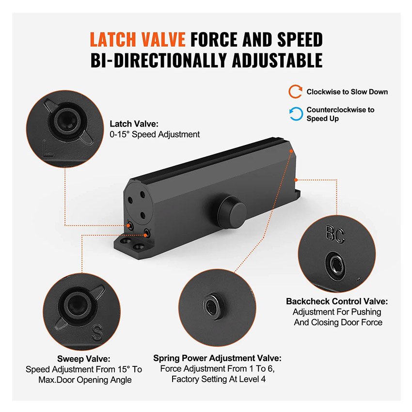 ✔ Entièrement réglable : vous pouvez ajuster la vitesse de verrouillage et de fermeture de la porte selon vos besoins. De plus, le réglage de la force d’amortissement permet un contrôle précis de l’effet amortissant, pour une fermeture de porte personnalisée.