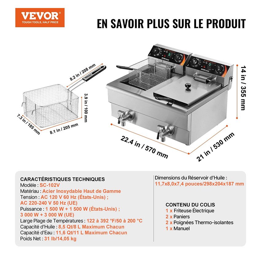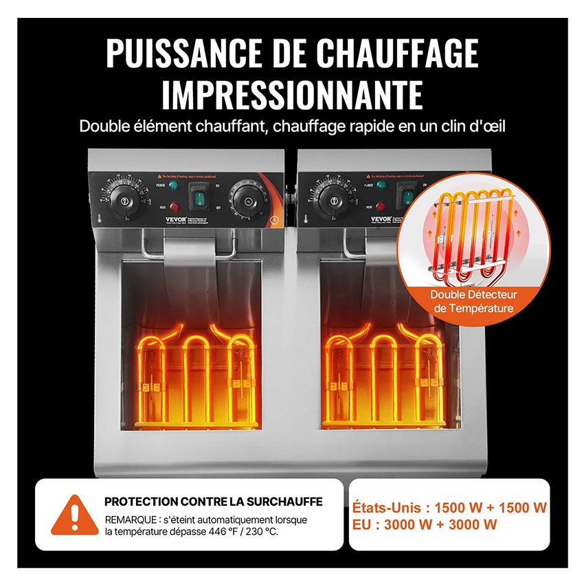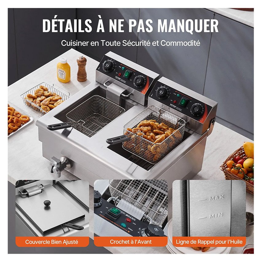 – Des plats chauds en un clin d’Ćil : Marre des temps de chauffe interminables ? Cette friteuse Ă©lectrique professionnelle est Ă©quipĂ©e de deux rĂ©sistances, permettant de chauffer l’huile Ă la tempĂ©rature souhaitĂ©e en un temps record. C’est parti ! Cuisinez vos aliments rapidement et Ă la perfection.