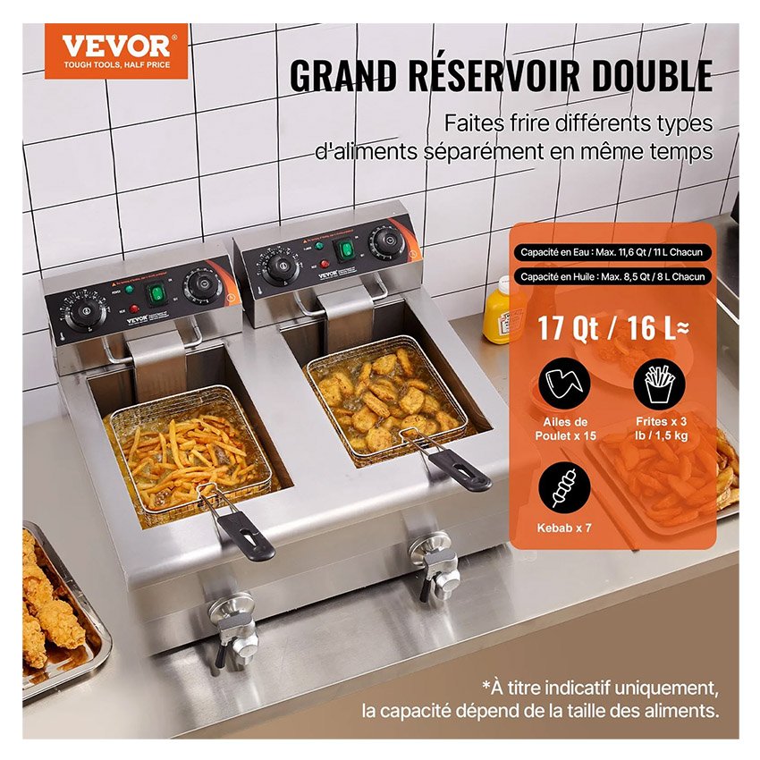 – Grande capacitĂ© : GrĂące Ă ses deux rĂ©servoirs dâhuile sĂ©parĂ©s (capacitĂ© dâeau : max. 11 l chacun, capacitĂ© dâhuile : max. 8 l chacun), cette friteuse Ă©lectrique professionnelle permet de frire diffĂ©rents types dâaliments individuellement tout en prĂ©servant leurs saveurs. IdĂ©ale pour les traiteurs, les stands de restauration rapide, les snacks et les rĂ©ceptions.