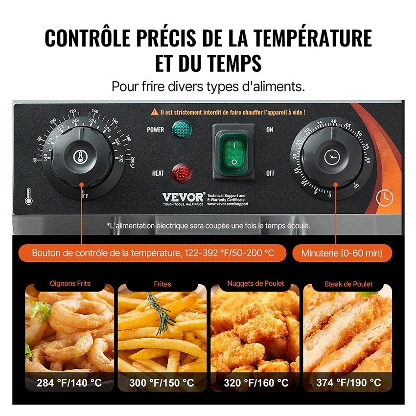 – ContrĂŽle de la tempĂ©rature et du temps : RĂ©glez facilement la tempĂ©rature de 50 Ă 200 °C (122 °F Ă 392 °F). Vous serez toujours prĂȘt Ă faire chauffer la friteuse ! Elle sâarrĂȘte automatiquement lorsque la tempĂ©rature dĂ©passe 230 °C (446 °F) ou en cas de panne du thermostat. De plus, elle est Ă©quipĂ©e dâune minuterie pour une cuisson sans interruption.