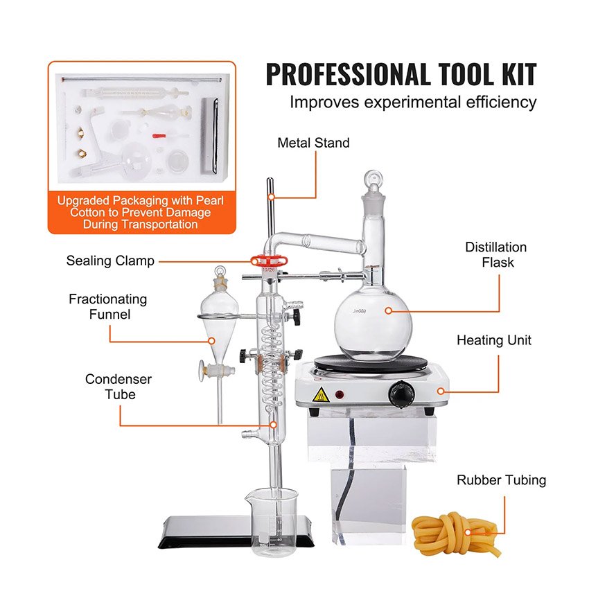 – Accessoires professionnels : équipés d’accessoires tels que des fioles coniques, des béchers, des brosses, etc., facilitant les utilisateurs dans la collecte et le traitement des produits expérimentaux et fournissant un support complet. Cet excellent équipement de distillation et de purification permet d’obtenir l’huile essentielle DIY que vous aimez.