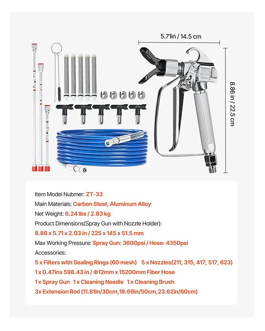 VEVOR Kit pistolet pulvérisateur peinture sans air et tuyau, 248 bar, ensemble tuyaux pulvérisation de peinture haute pression avec 5 embouts, joint pivotant, avec filtres, tuyau et tiges d’extension