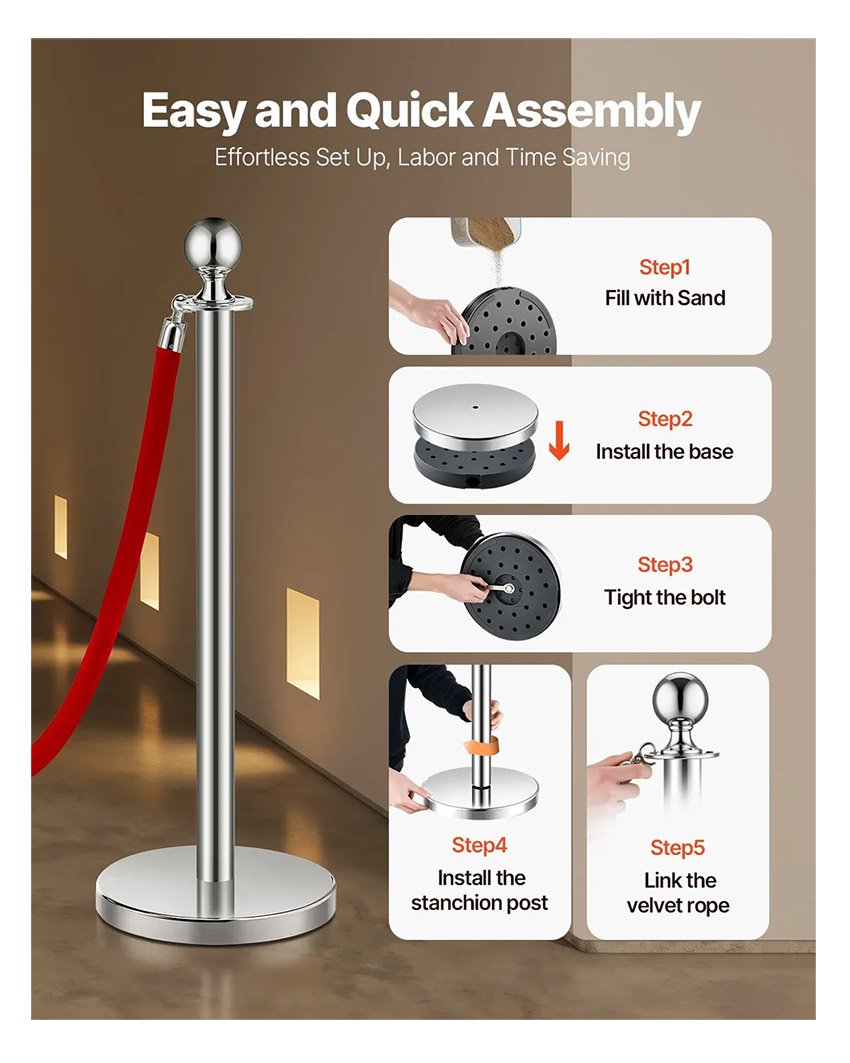 ✔ Montage rapide : aucun outil requis. Remplissez-le simplement de sable et vissez la base en place, et vos cordes et supports en velours sont prêts à l’emploi. Facile à installer et encore plus facile à utiliser quand vous en avez besoin