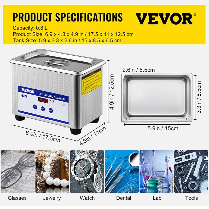 VEVOR Machine de Nettoyage à Ultrasons 0,8 L, Écran Affichage LED 220 V, Nettoyeur Acier Inoxydable pour le Nettoyage des Bijoux Pièces de Monnaie Lunettes