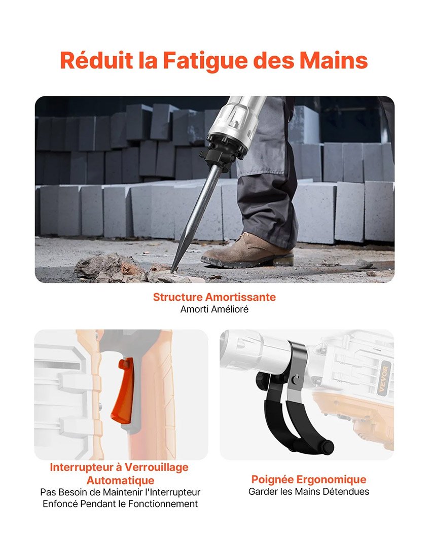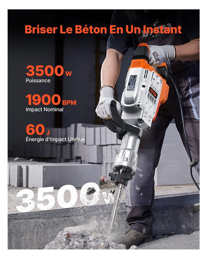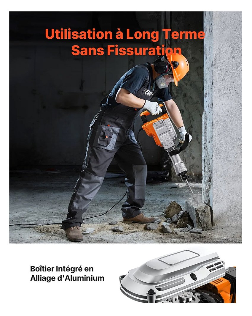 – Performances Exceptionnelles & Haute Qualité : Un moteur industriel de 3500 W avec une énergie d’impact de 60 J est conçu pour réaliser des projets de bétonnage et de métallurgie de manière rapide et précise. Il est destiné aux professionnels. Ce marteau démolisseur électrique adopte une construction en aluminium robuste, il est très durable et résiste à la corrosion pour une utilisation à long terme. Nous réinventons le burinage. Vous allez adorer bricoler.