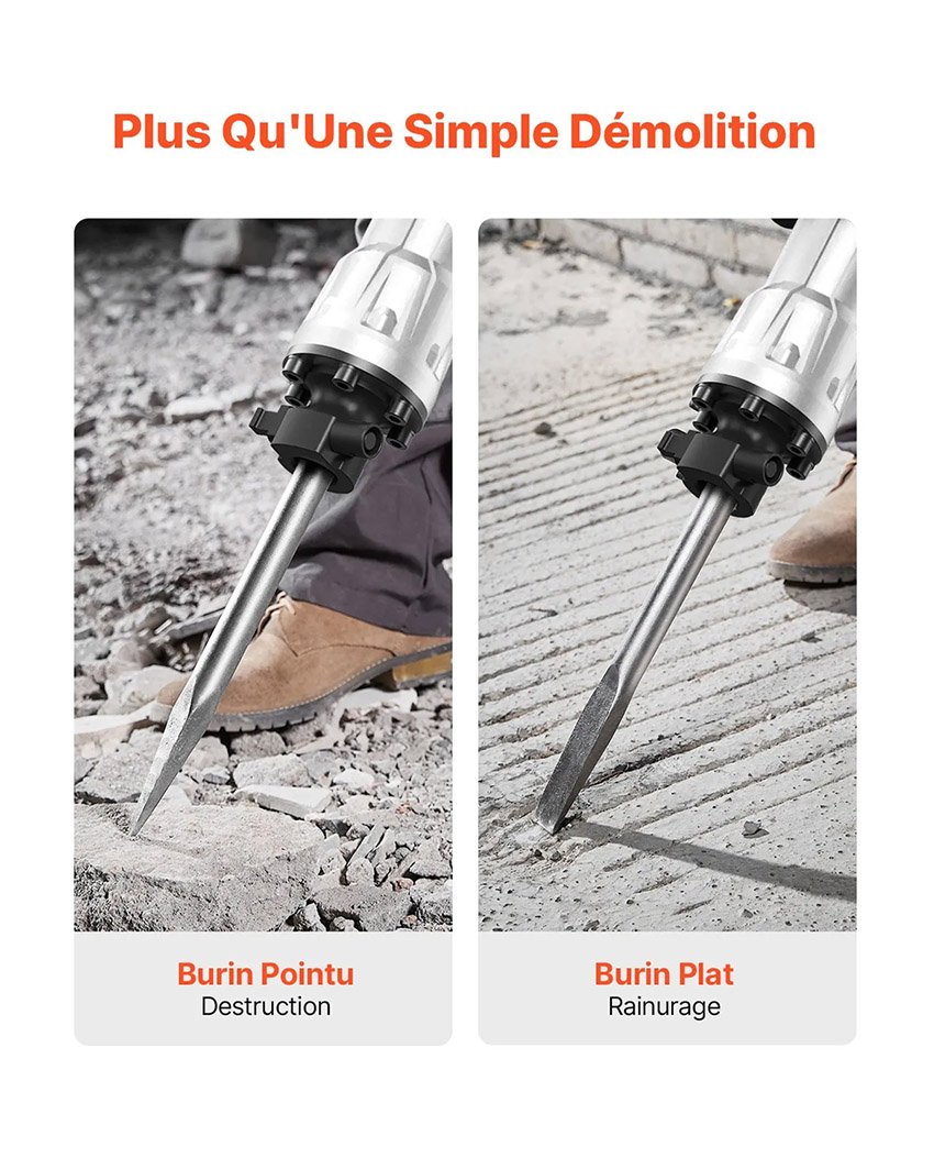 VEVOR Marteau de Démolition 3500 W Marteau-Piqueur 60 J 1900 BPM Marteau Perforateur avec 2 Burins Remplaçables Poignée Rotative 360° Anti-Vibration Brise-Béton pour Burinage Construction Plomberie