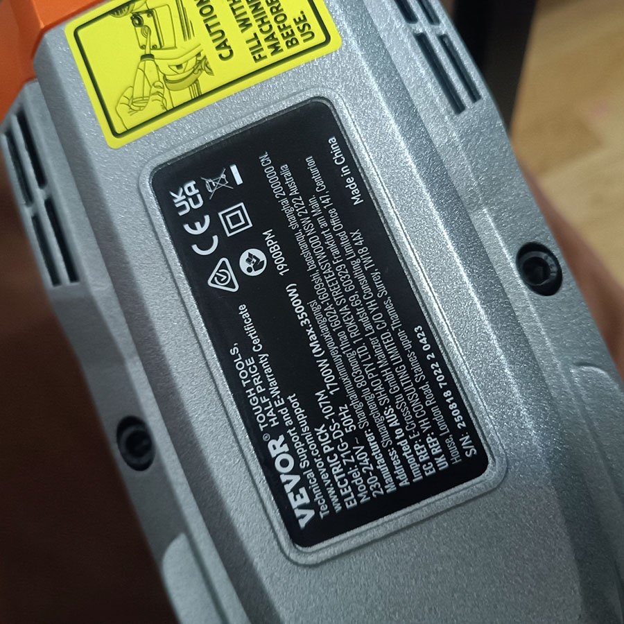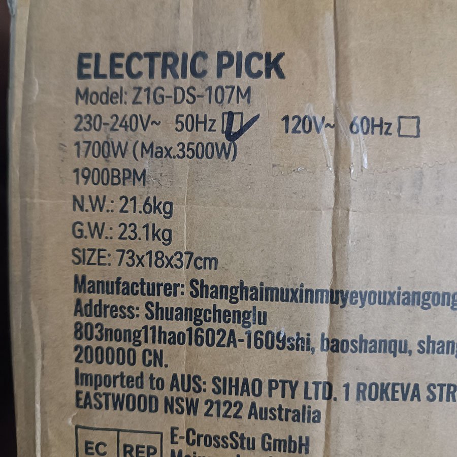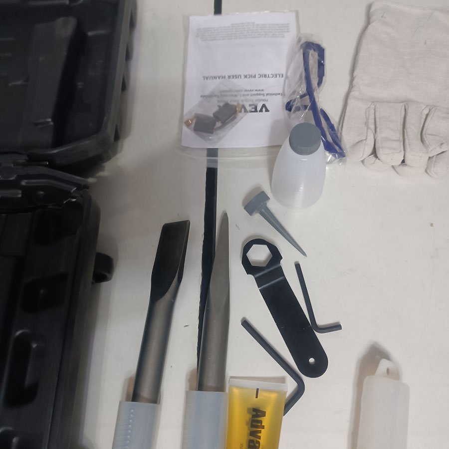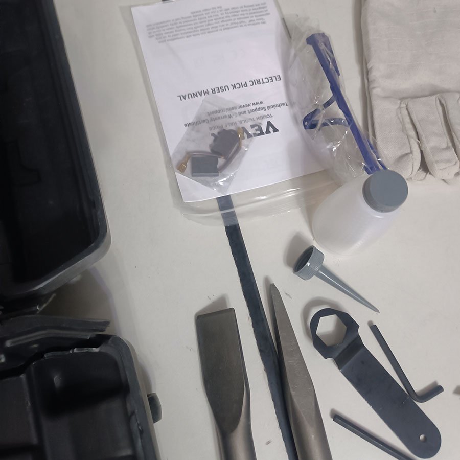 ⚠️ À noter : le coffret de transport présente une fissure visible (voir dernière photo), survenue lors du transport en raison du poids conséquent de la machine (environ 22 kg). Cela n’affecte en rien le bon fonctionnement du marteau-piqueur, qui reste pleinement opérationnel.