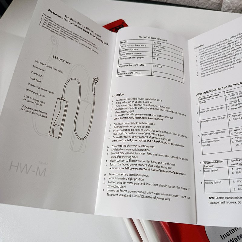 – Indicateur lumineux LED: indicateur LED pour indiquer l’état d’alimentation et de chauffage. Il peut fournir un débit d’eau chaude dont la température pourrait atteindre jusqu’à 50 ° C.