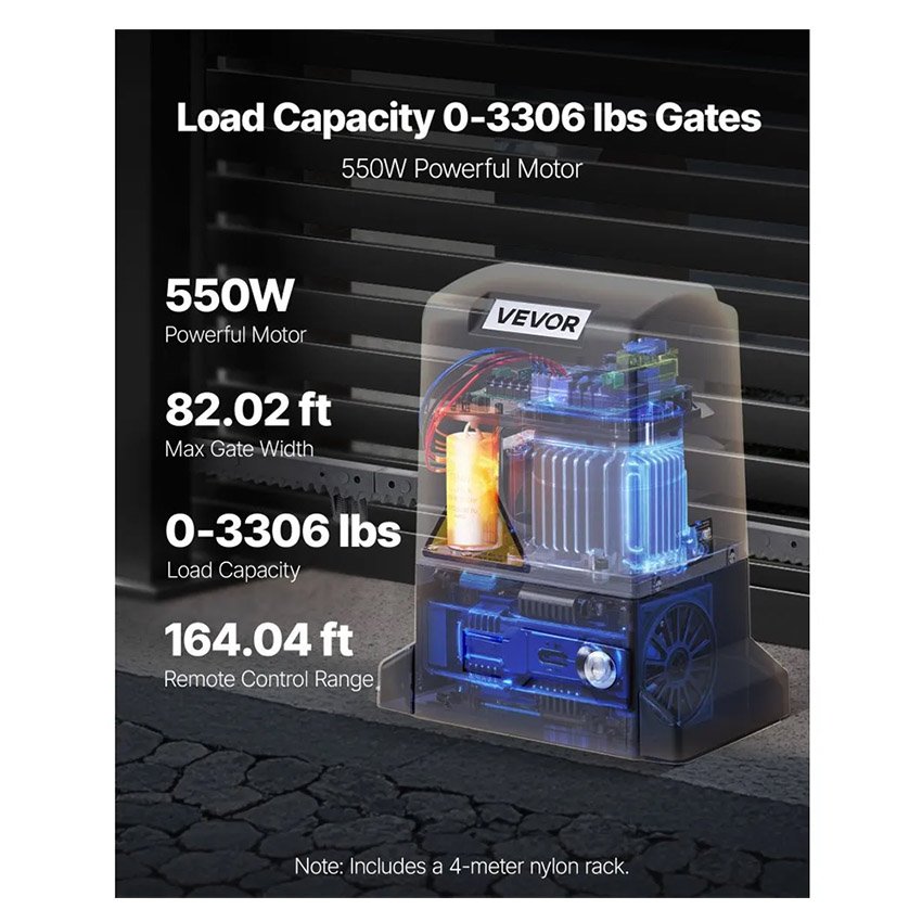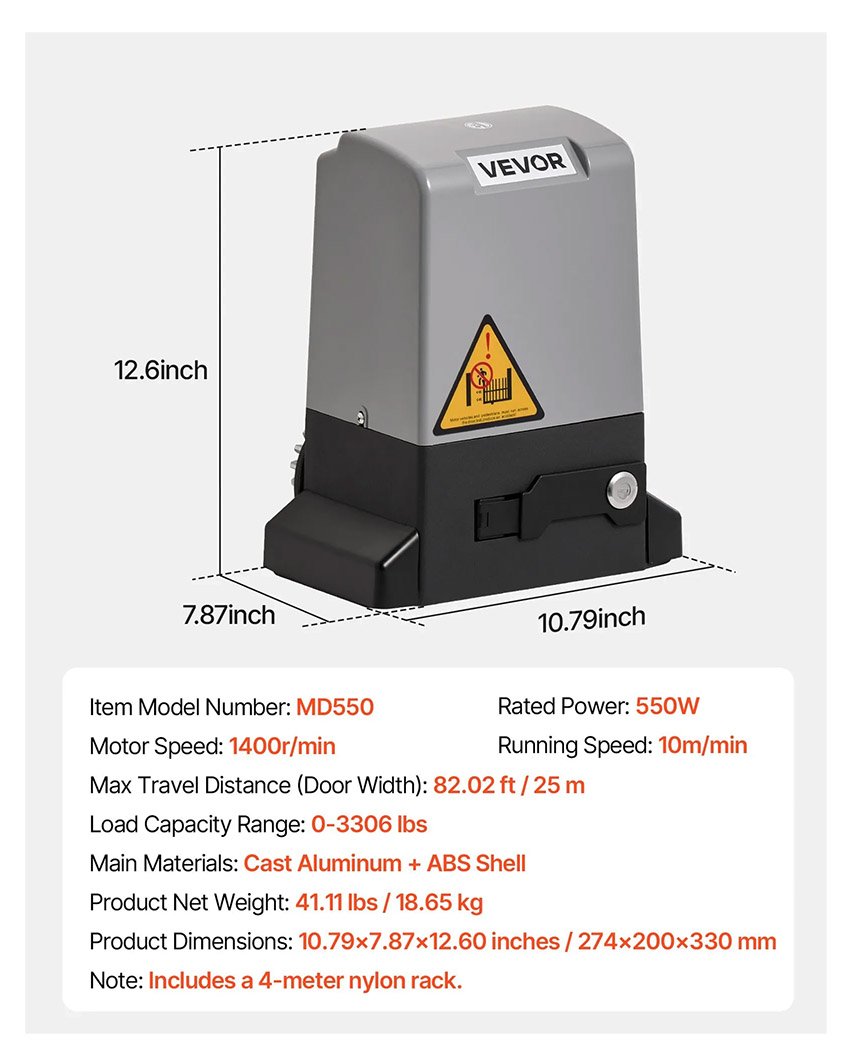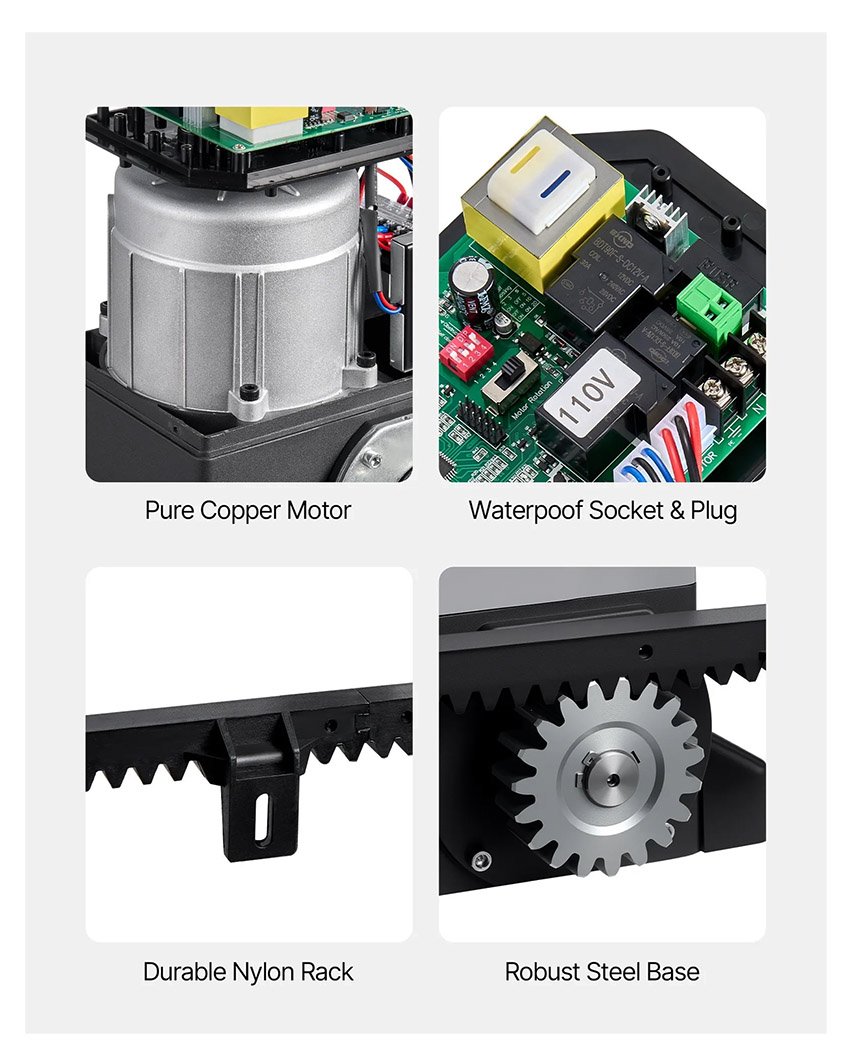 ✔ Performances puissantes et capacité de charge élevée : Avec un moteur en cuivre pur de 550 W et une vitesse de 1 400 tr/min, cette motorisation de portail coulissant prend en charge des portails jusqu’à 3 306 lb/1 500 kg (jusqu’à 82,02 pi/25 m de large)