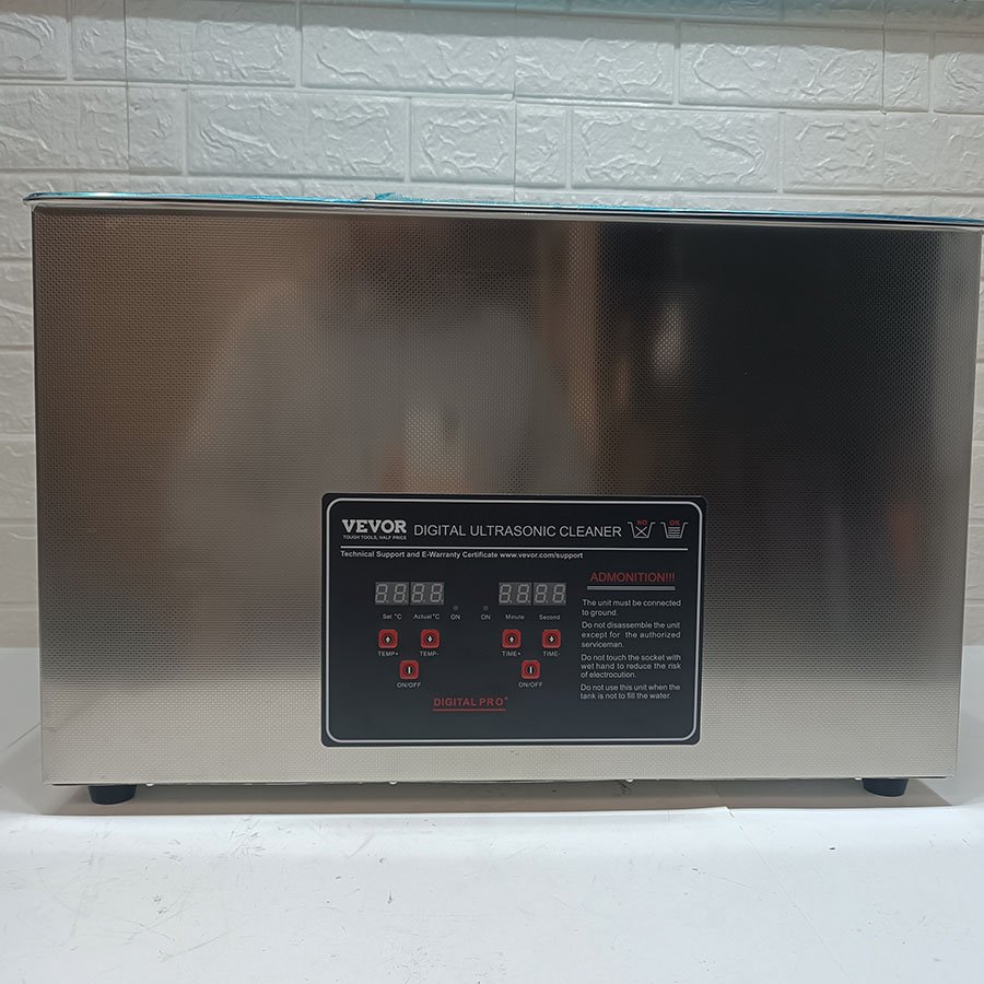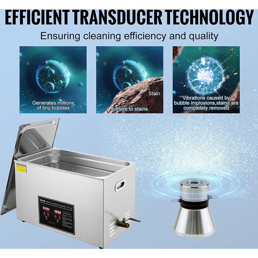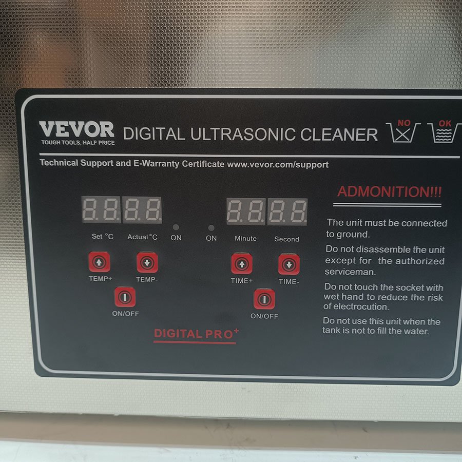 – Contrôle du temps et de la température : Réglez le temps de nettoyage sur une valeur comprise entre 0 et 30 minutes ou réglez la température sur une valeur comprise entre 0 °C et 80 °C (176 °F). Les écrans LED font de la surveillance un jeu d’enfant. La fonction de chauffage intégrée augmente considérablement l’efficacité du nettoyage et vous pouvez activer à la fois le nettoyage par ultrasons et le chauffage