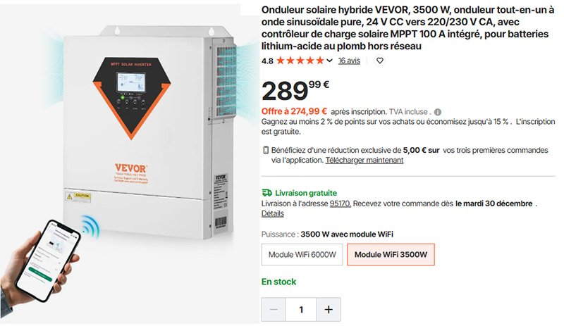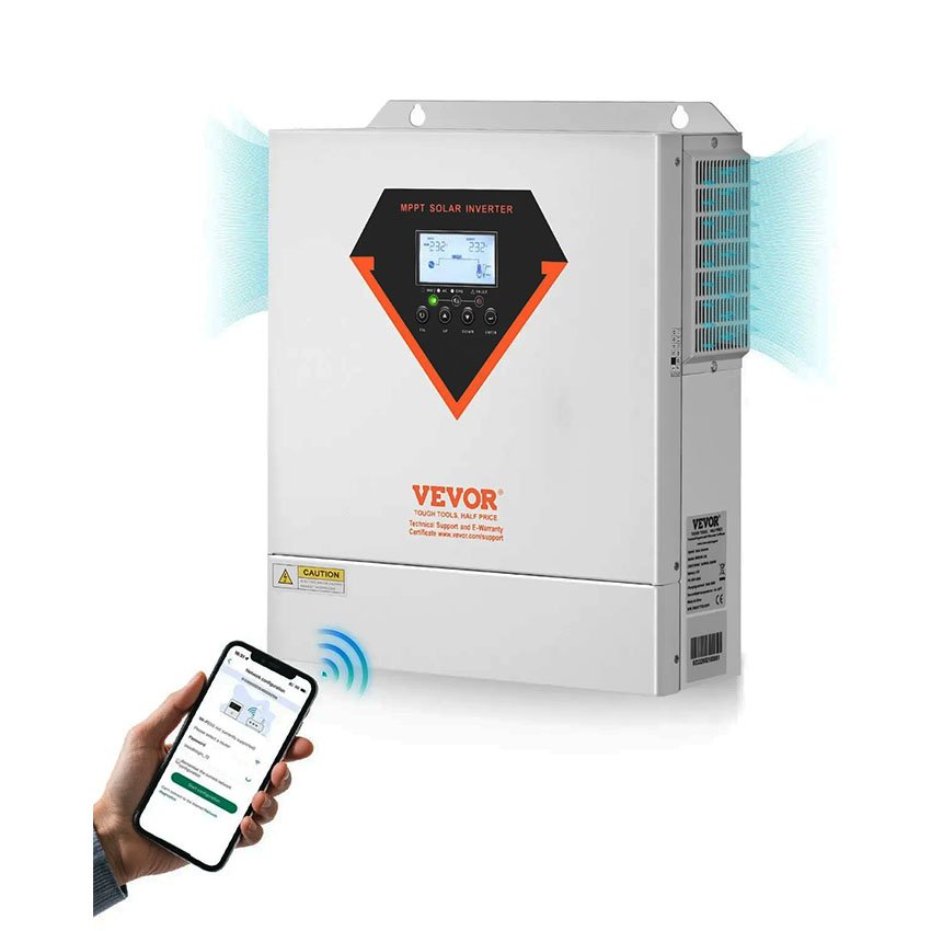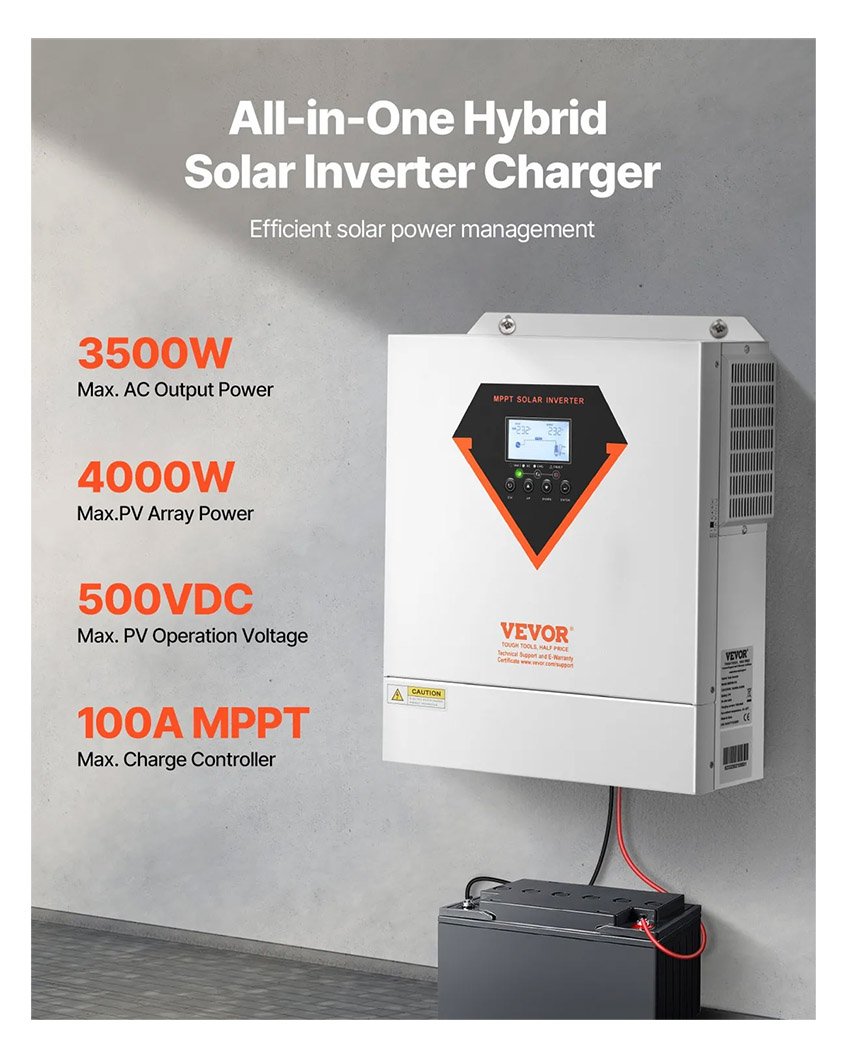 Onduleur solaire hybride VEVOR 3500 W onduleur tout-en-un à onde sinusoïdale pure 24 V CC vers 220/230 V CA avec contrôleur de charge solaire MPPT 100 A intégré pour batteries lithium-acide au plomb hors réseau