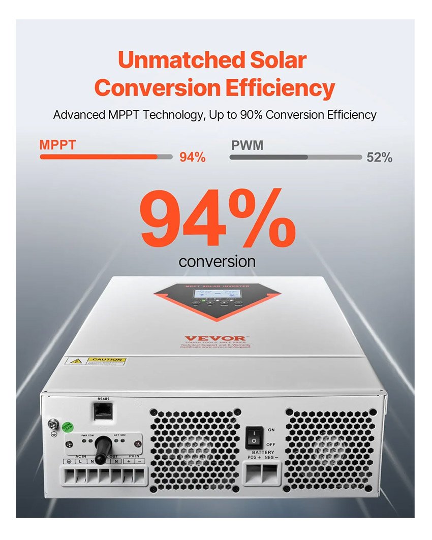 – Technologie de charge MPPT performante : Doté d’un contrôleur de charge solaire MPPT avancé, cet onduleur solaire hybride prend en charge la charge des batteries jusqu’à 100 A et porte le rendement de conversion de l’énergie solaire à 94 %. Il supporte une puissance de sortie maximale de 4 000 W et une plage de tension de 60 V à 500 V CC, ce qui le rend compatible avec une large gamme de systèmes solaires.