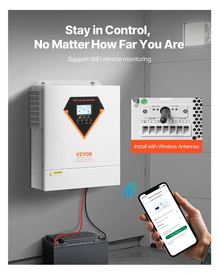 – Surveillance intelligente, gardez le contrôle : grâce à son module Wi-Fi intégré, cet onduleur solaire permet une surveillance à distance via Wi-Fi et offre une excellente stabilité de connexion, vous permettant de suivre l’état de votre système à tout moment et où que vous soyez. De plus, vous pouvez facilement configurer différents modes de charge (solaire uniquement, réseau uniquement ou hybride solaire/réseau) et modes de sortie (UTL, SOL, SBU et SUB) à l’aide des boutons de l’appareil. Idéal pour alimenter la plupart des appareils de votre maison ou de votre bureau.