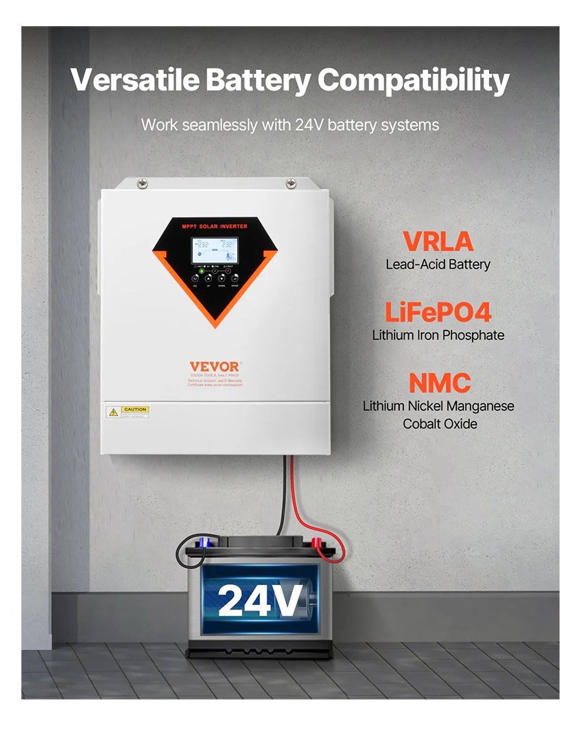 – Compatible avec différents types de batteries : notre chargeur-onduleur hybride est conçu pour les systèmes de batteries 24 V et prend en charge une large gamme de batteries, notamment au lithium, au plomb et les batteries spéciales. Il est optimisé pour les systèmes de batteries au lithium et dispose d’une fonction d’activation pour améliorer les performances de la batterie.