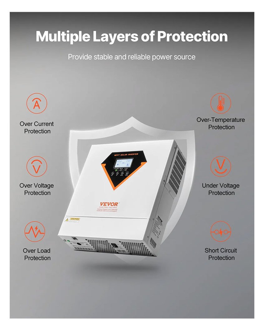 – Protection complète : La sécurité de votre système est notre priorité absolue. Cet onduleur solaire hybride hors réseau est doté de multiples protections, notamment contre la surchauffe, la surintensité, la surtension, la sous-tension, les courts-circuits et les surcharges. Vous n’avez donc aucun souci à vous faire concernant votre circuit électrique et votre source d’alimentation.