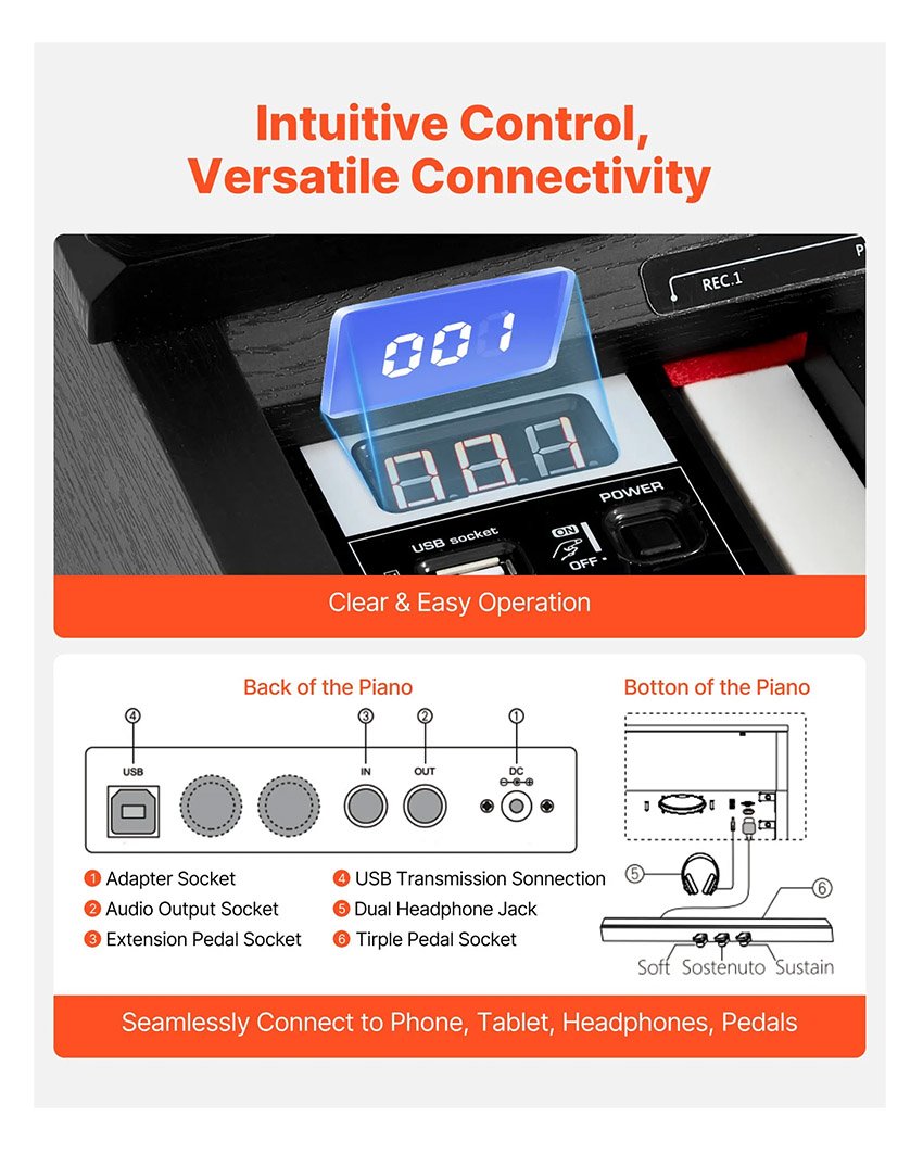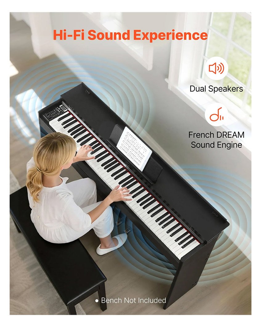 – Toucher et son réalistes : Doté d’un clavier de 88 touches lestées avec mécanisme à marteaux et 3 niveaux de sensibilité, ce piano à clavier lesté reproduit fidèlement les sensations d’un piano acoustique. Idéal pour les débutants et une utilisation quotidienne.