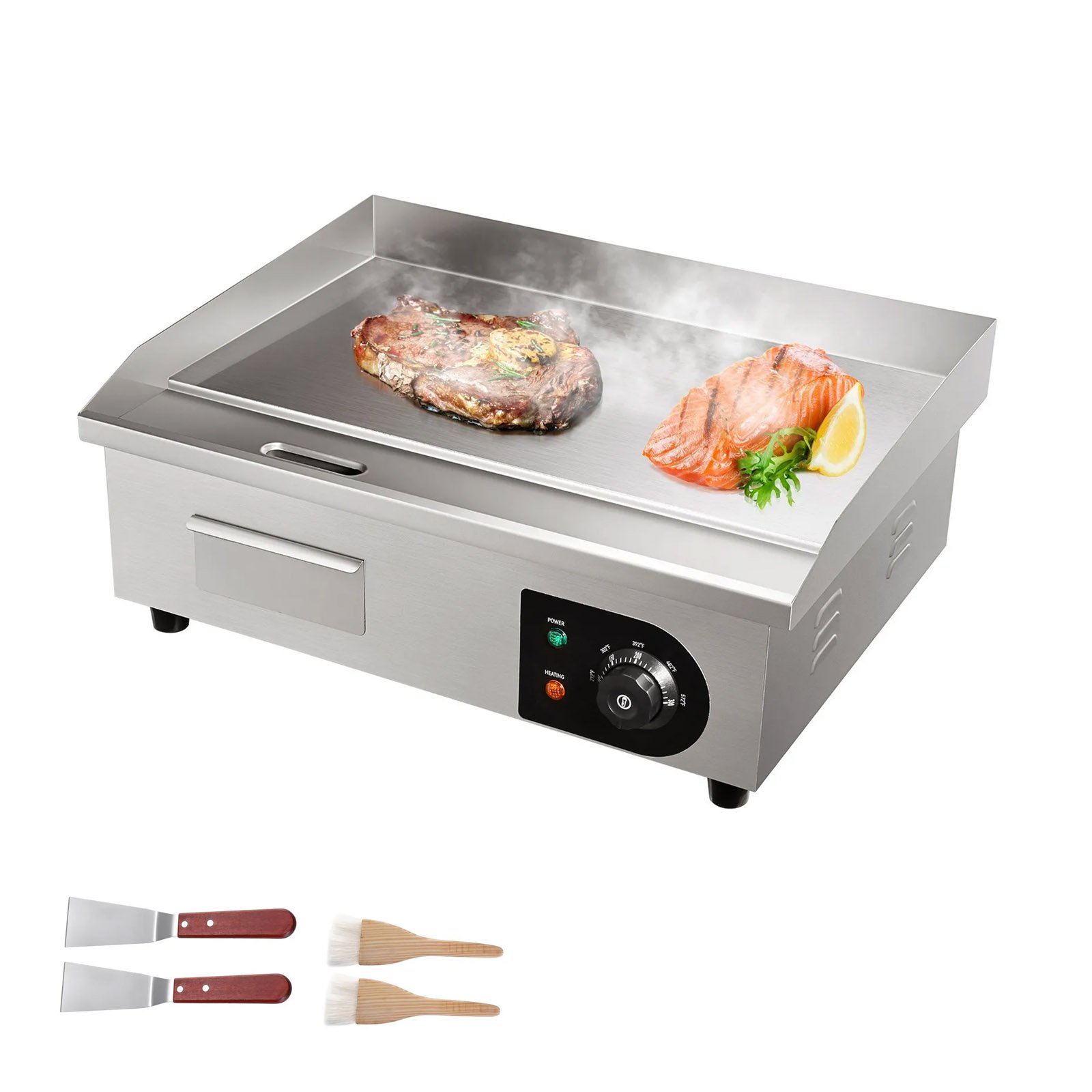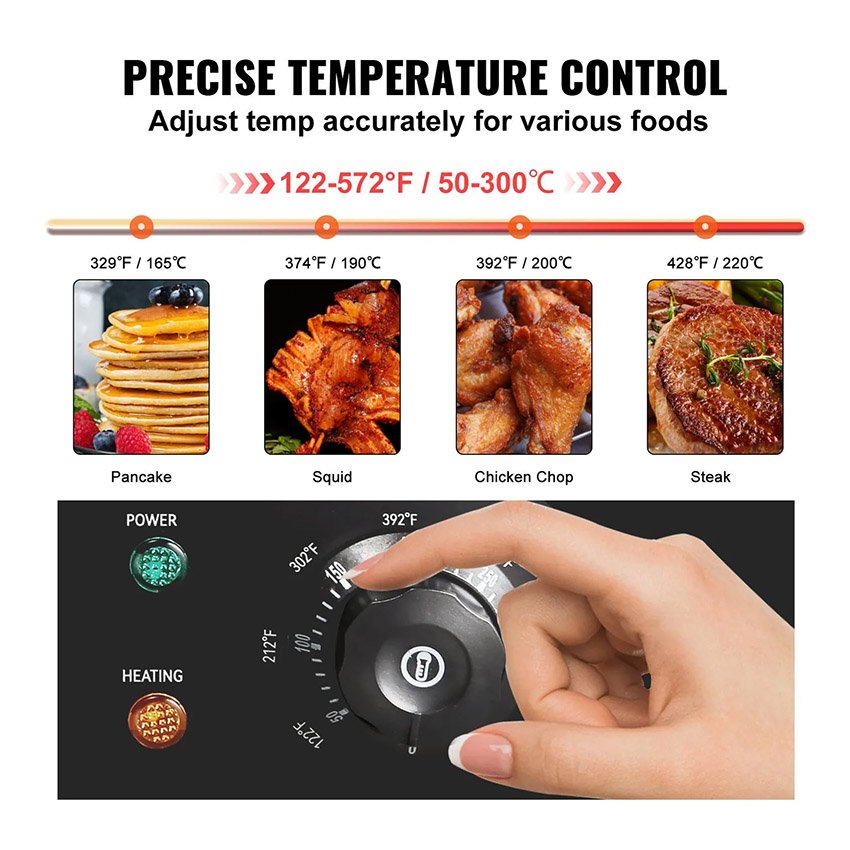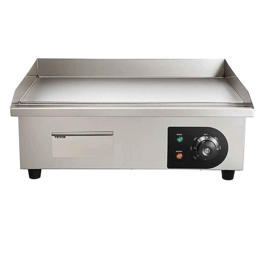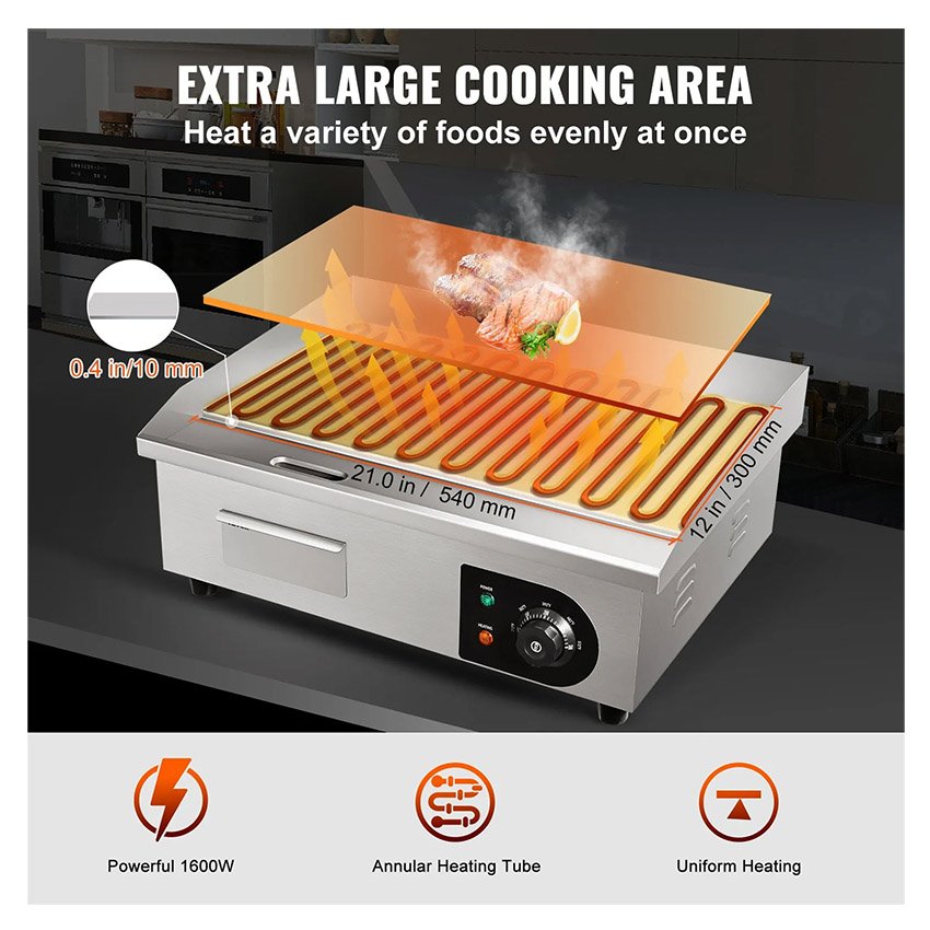 – Contrôle Précis du Chauffage : Cette plancha plate est munie de commandes de température réglables pour garantir une cuisson parfaite des aliments. La plage de température s’étend de 50 °C à 300 °C.