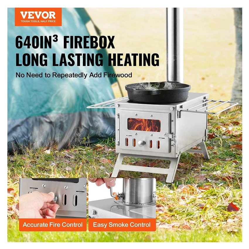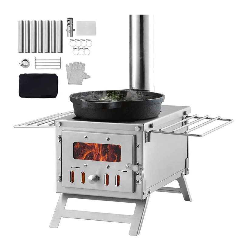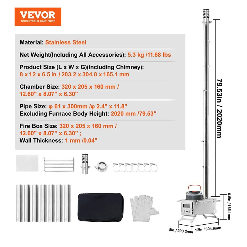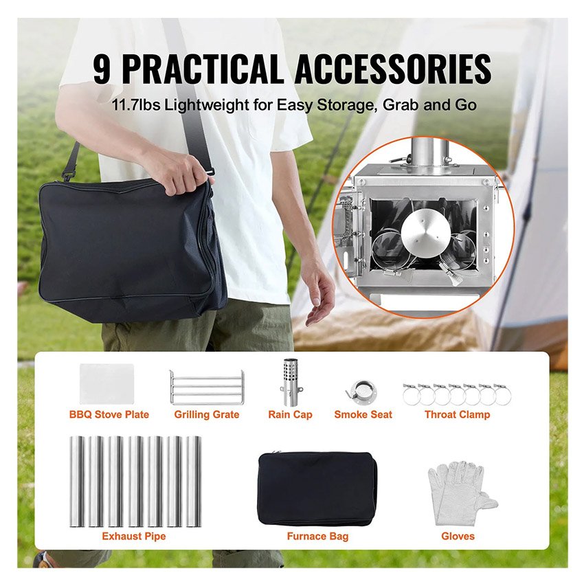 VEVOR Poêle à bois poêle de tente de camping en acier inoxydable portable avec 8 tuyaux de cheminée et gants, poêle de tente chaude pour la cuisine et le chauffage en plein air