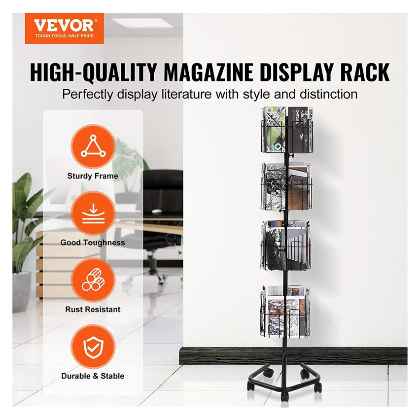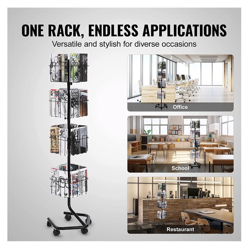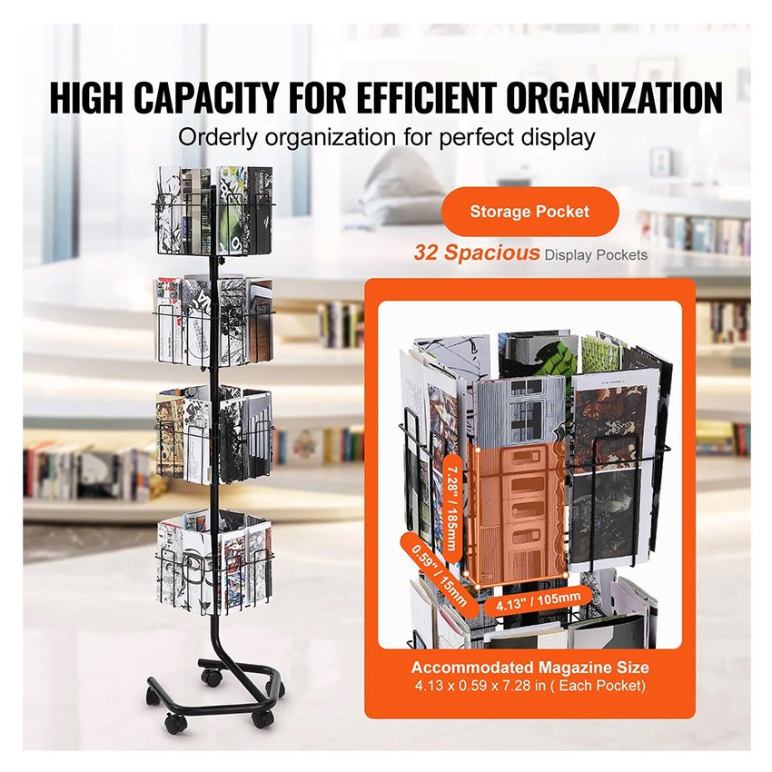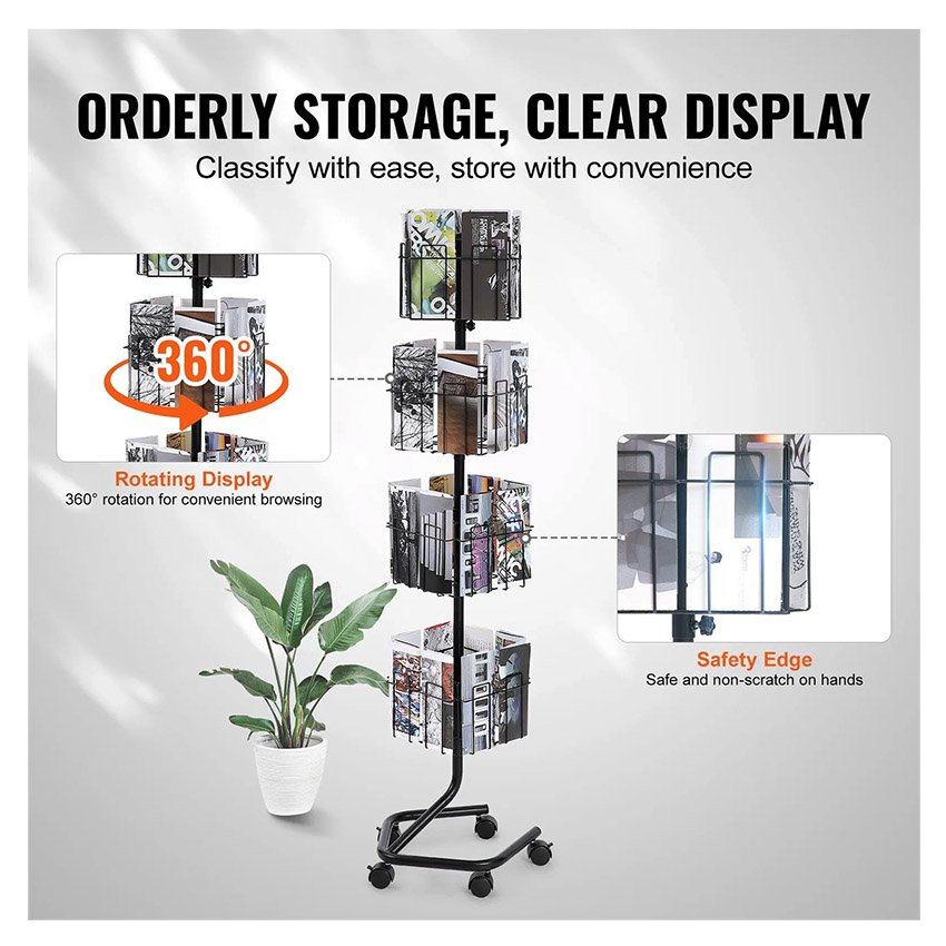 VEVOR Présentoir à brochures 4 niveaux 32 compartiments rotatif pour magazines cartes postales et cartes de vœux Équipé de 5 roulettes (dont 2 verrouillables), il est idéal pour les magasins, les expositions et les bureaux.