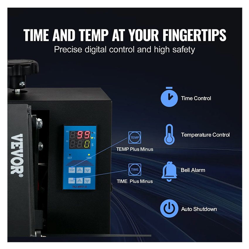 – Panneau de commande numérique : Cette presse à chaud est équipée d’un panneau de commande précis permettant de régler avec exactitude la température et la durée. Une fois le chauffage terminé, la machine émet automatiquement une alarme pour vous avertir de retirer les articles. Plage de température : 0 à 570 °F / 0 à 299 °C ; Durée : 0 à 999 secondes.